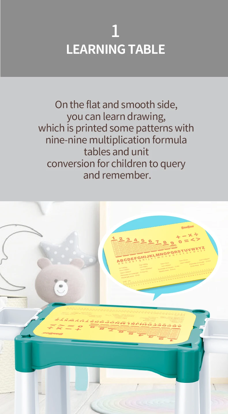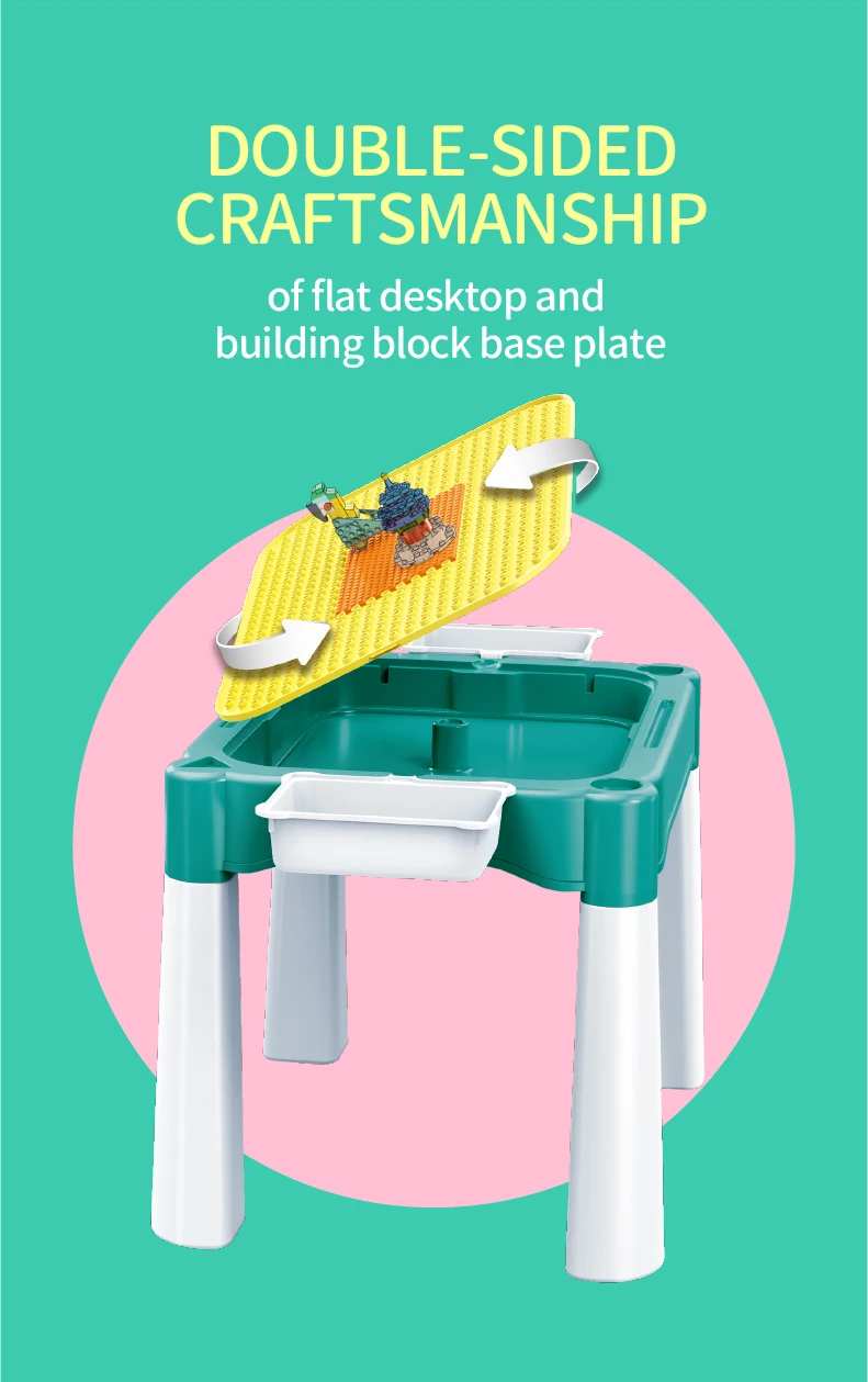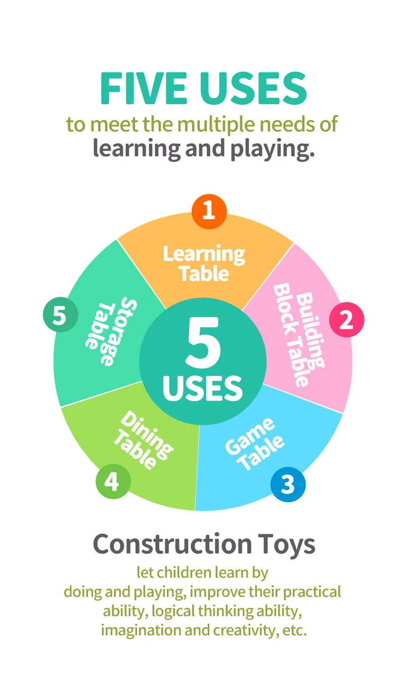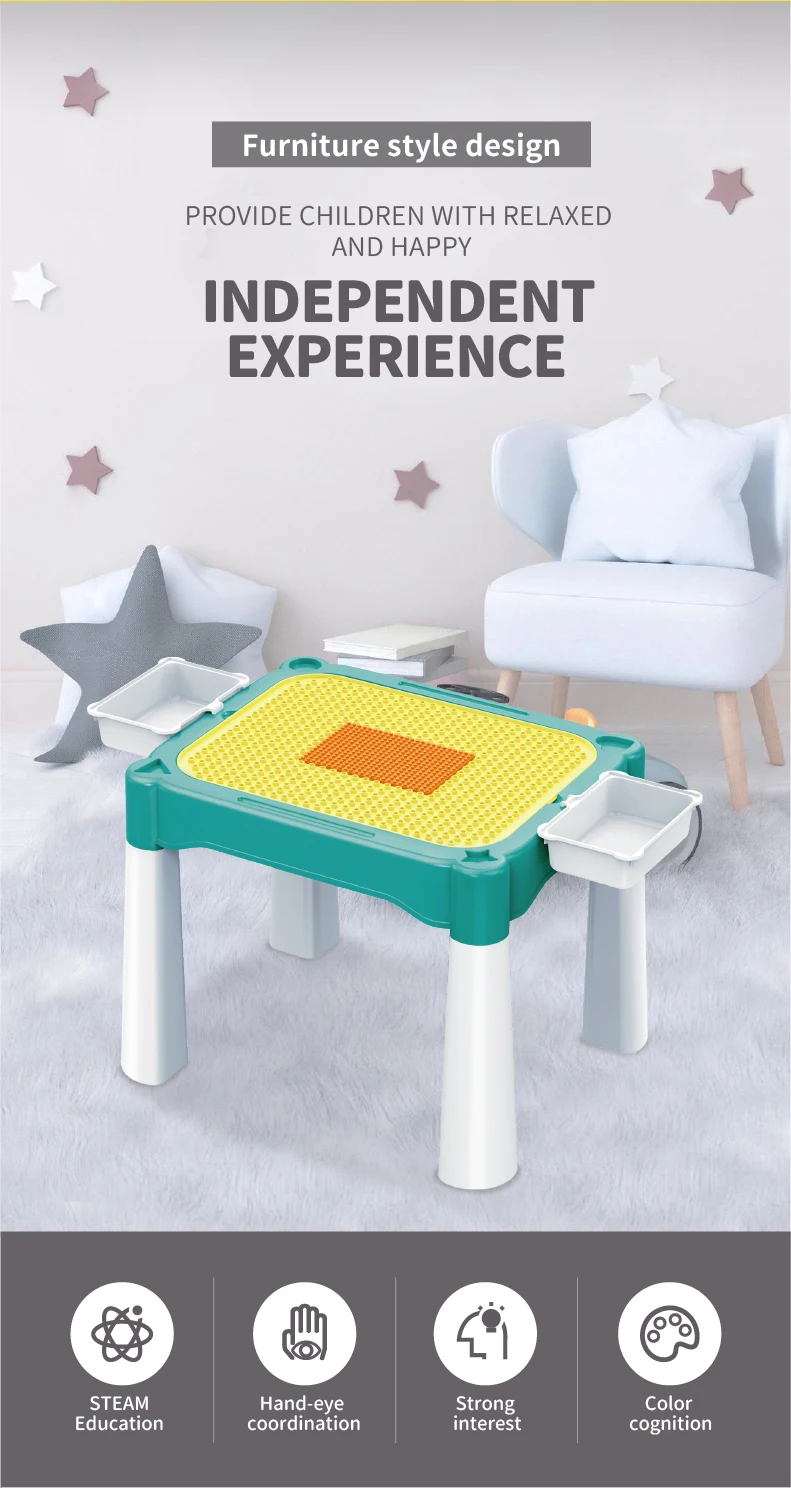 Set "Universal table 5 in 1 + Chair + Construction set" "Universal table 5 in 1 + Chair + Construction set"The set consists of a multifunctional table and a comfortable chair for children from 1 to 6 years old. It is transformed in accordance with the changing needs and interests of children. The set "Multifunctional table 5 in 1 + Chair + Construction set" is a must-have for your child. The modern design and bright colors of the set will be a stylish addition to the play area. The lightweight design allows the child to move the chair independently, lift and flip the table cover and side compartments. Children will be delighted to have their own set of children's furniture, just like adults! The sturdy and durable set can be used both indoors and outdoors. classes or lunch.The table has containers with a lid and a large compartment under the play panel for storing children's accessories.The chair has a comfortable back and seat for the formation of correct and healthy posture.The set is suitable for use outdoors - in the garden or on the terrace/balcony. In the center of the table there is a hole for inserting a garden umbrella (not included).A special 2-in-1 cap is included to cover the hole in the large compartment, so that it can be filled with water or sand.The table and chairs can be assembled/disassembled very easily and have no sharp corners, which ensures high safety.Easy to wash and clean.No more scattered parts on the carpet or under the sofa! Convenient storage, sorting of parts and other accessories!