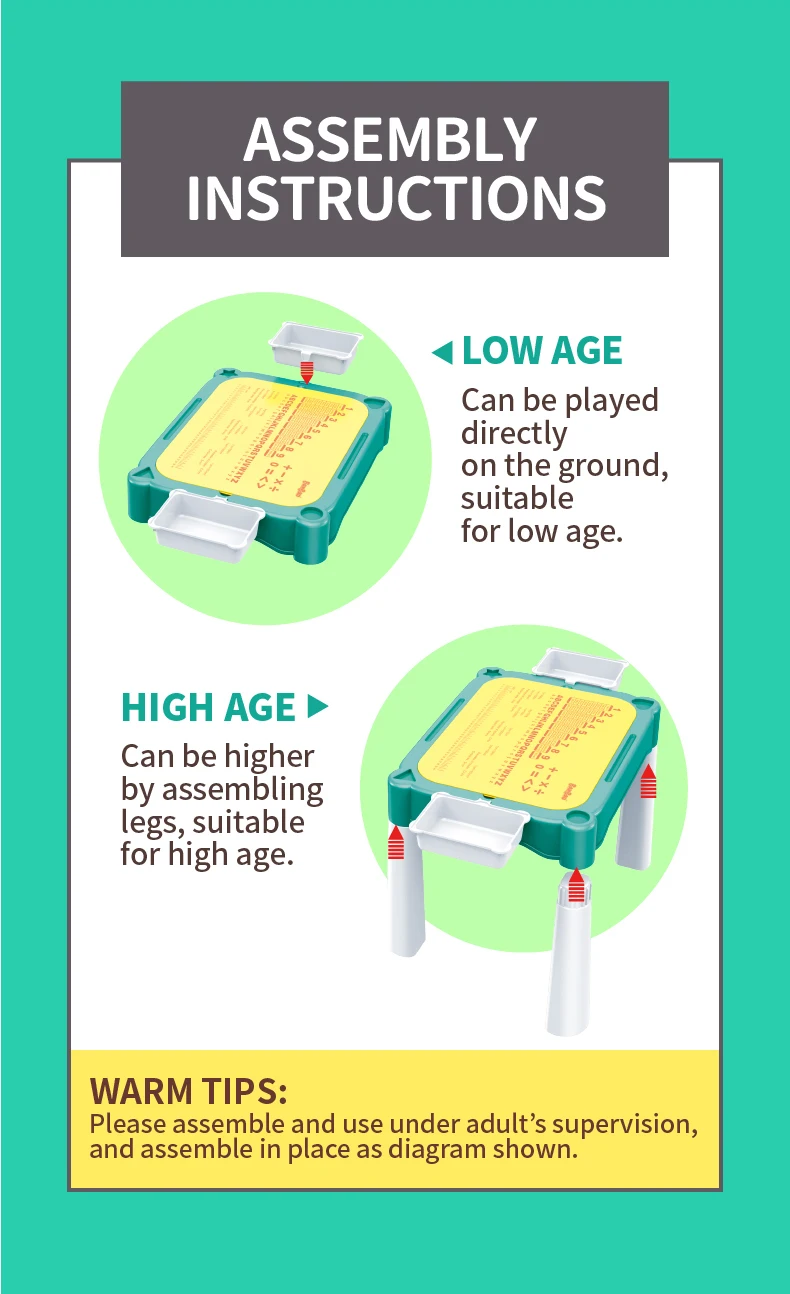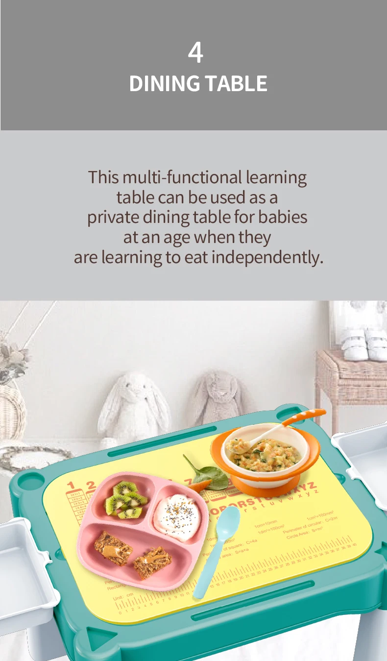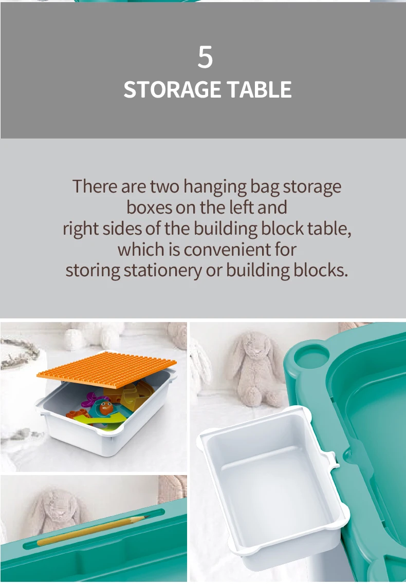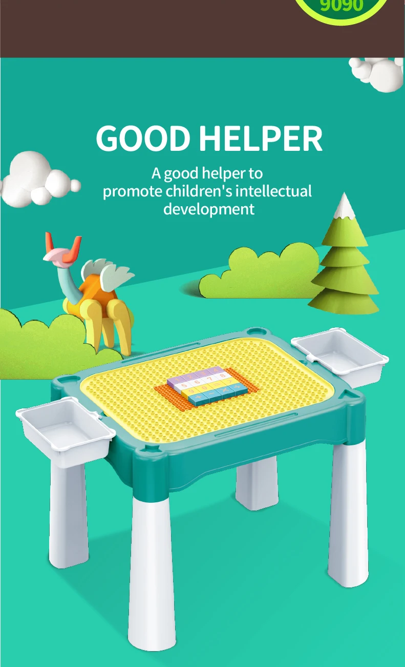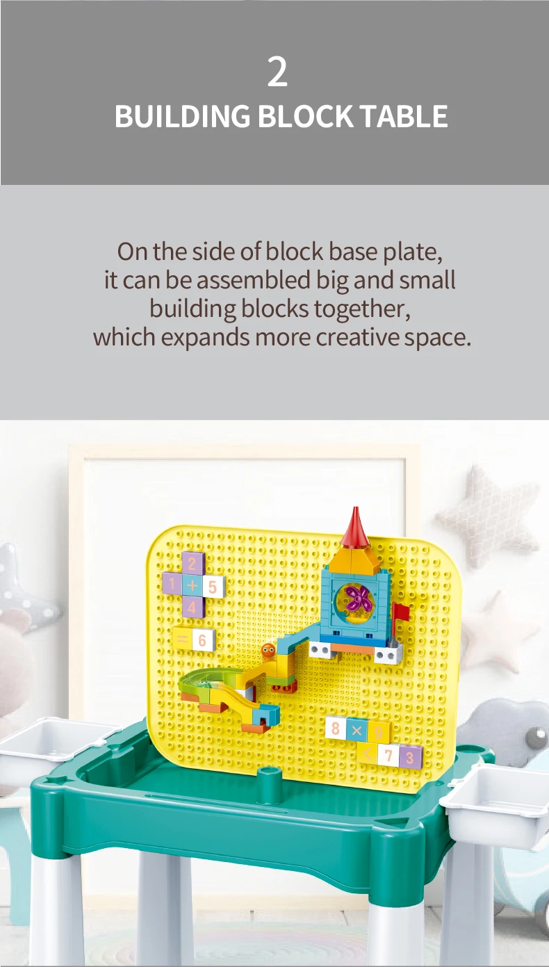 Set "Universal table 5 in 1 + Chair + Construction set" "Universal table 5 in 1 + Chair + Construction set"The set consists of a multifunctional table and a comfortable chair for children from 1 to 6 years old. It is transformed in accordance with the changing needs and interests of children. The set "Multifunctional table 5 in 1 + Chair + Construction set" is a must-have for your child. The modern design and bright colors of the set will be a stylish addition to the play area. The lightweight design allows the child to move the chair independently, lift and flip the table cover and side compartments. Children will be delighted to have their own set of children's furniture, just like adults! The sturdy and durable set can be used both indoors and outdoors. classes or lunch.The table has containers with a lid and a large compartment under the play panel for storing children's accessories.The chair has a comfortable back and seat for the formation of correct and healthy posture.The set is suitable for use outdoors - in the garden or on the terrace/balcony. In the center of the table there is a hole for inserting a garden umbrella (not included).A special 2-in-1 cap is included to cover the hole in the large compartment, so that it can be filled with water or sand.The table and chairs can be assembled/disassembled very easily and have no sharp corners, which ensures high safety.Easy to wash and clean.No more scattered parts on the carpet or under the sofa! Convenient storage, sorting of parts and other accessories!