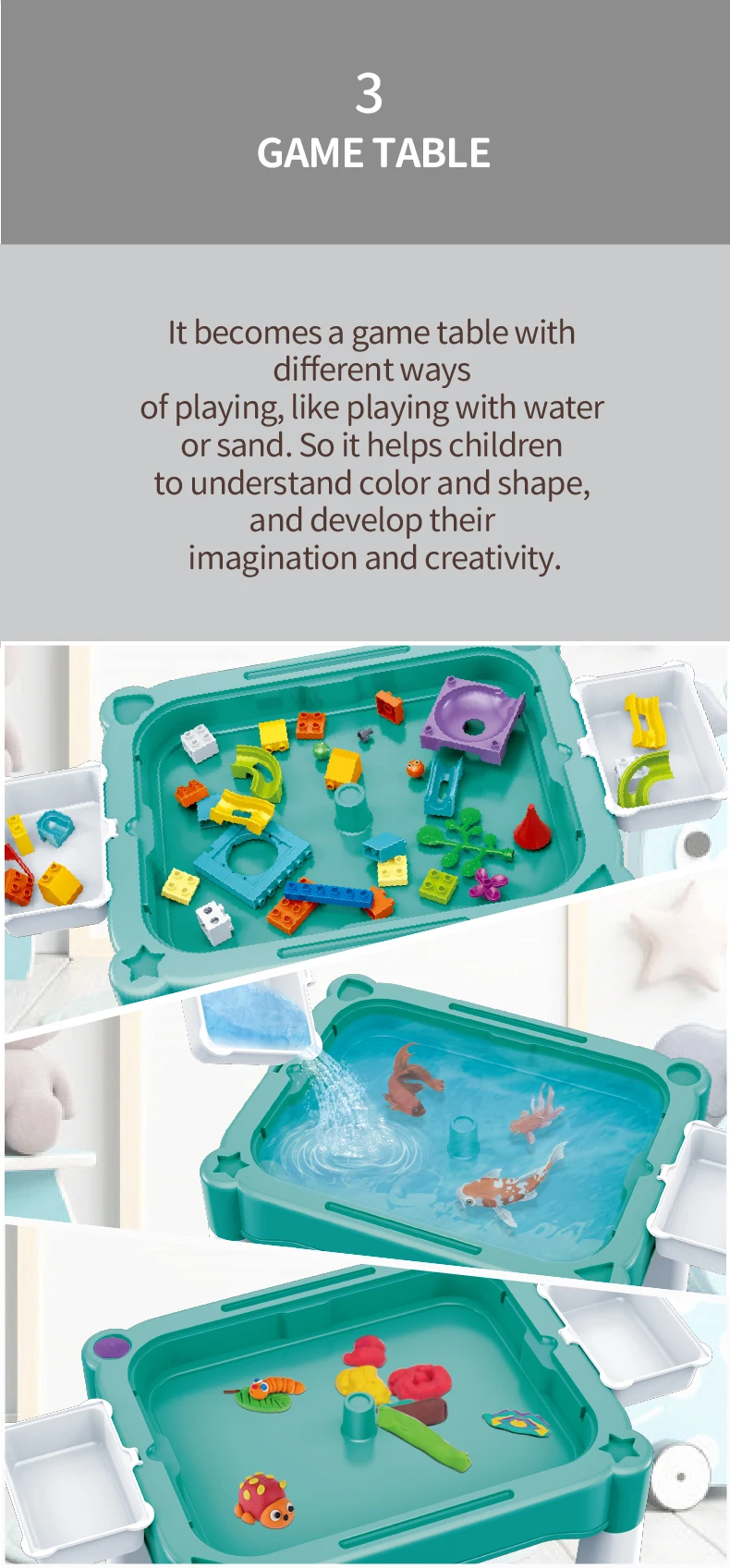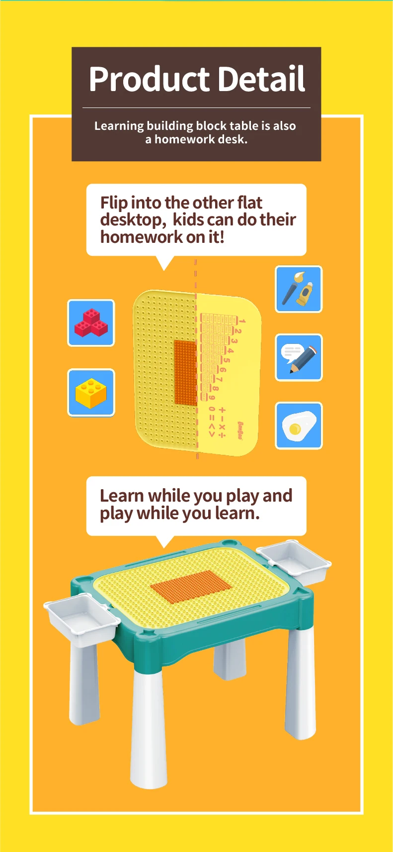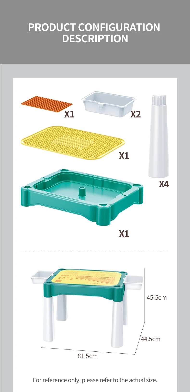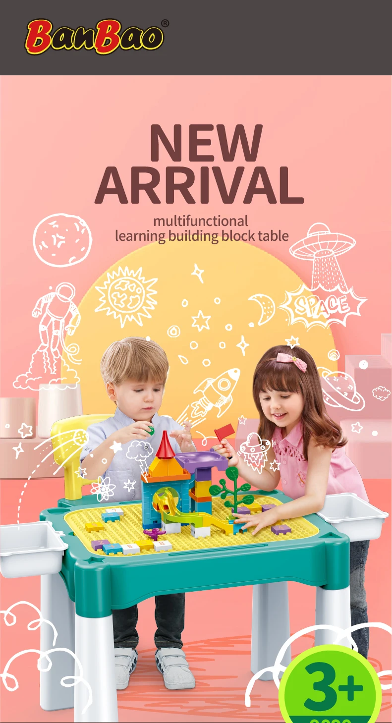 Set "Universal table 5 in 1 + Chair + Construction set" "Universal table 5 in 1 + Chair + Construction set"The set consists of a multifunctional table and a comfortable chair for children from 1 to 6 years old. It is transformed in accordance with the changing needs and interests of children. The set "Multifunctional table 5 in 1 + Chair + Construction set" is a must-have for your child. The modern design and bright colors of the set will be a stylish addition to the play area. The lightweight design allows the child to move the chair independently, lift and flip the table cover and side compartments. Children will be delighted to have their own set of children's furniture, just like adults! The sturdy and durable set can be used both indoors and outdoors. classes or lunch.The table has containers with a lid and a large compartment under the play panel for storing children's accessories.The chair has a comfortable back and seat for the formation of correct and healthy posture.The set is suitable for use outdoors - in the garden or on the terrace/balcony. In the center of the table there is a hole for inserting a garden umbrella (not included).A special 2-in-1 cap is included to cover the hole in the large compartment, so that it can be filled with water or sand.The table and chairs can be assembled/disassembled very easily and have no sharp corners, which ensures high safety.Easy to wash and clean.No more scattered parts on the carpet or under the sofa! Convenient storage, sorting of parts and other accessories!