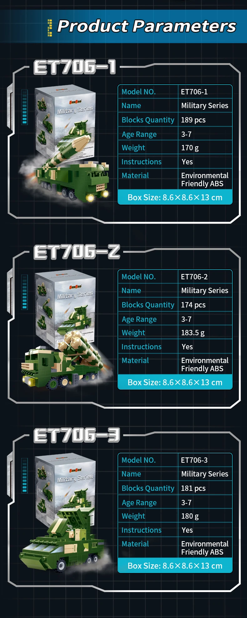 Army construction set (181 elements) Intelligence center Build your own unique world with the BanBao construction set! This exciting building block toy brings unlimited creativity and possibilities to your home. Each piece has its own specific place, and the step-by-step guide helps you create the perfect character or unusual artifact. From epic battle robots to exciting heroes and incredible worlds, BanBao allows you to turn any idea into into reality. This construction set is not only an entertaining toy, but also a unique opportunity for your child to develop spatial thinking, creativity and logic skills, during which they will enjoy every moment of construction and be proud of their own masterpiece. With BanBao, your possibilities are endless - let your imagination run wild!
