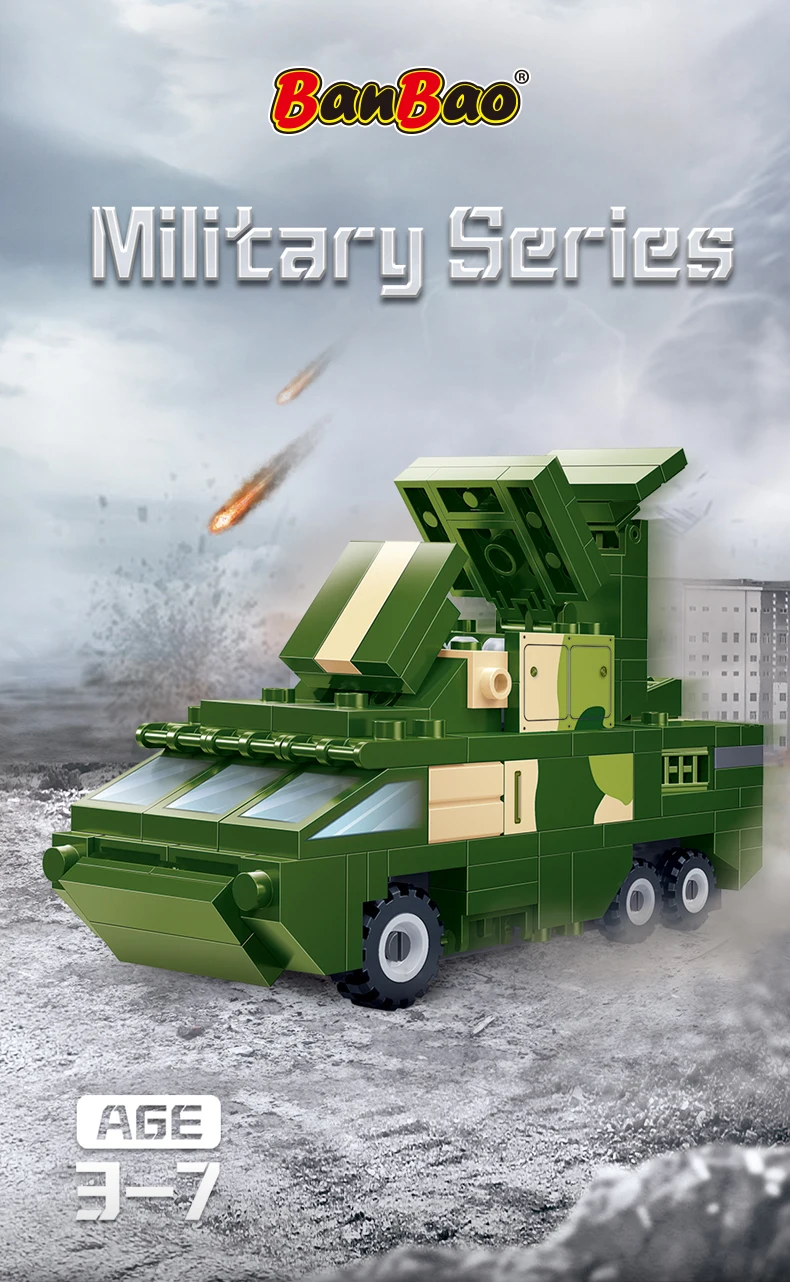 Construction set "Army" (189 elm) Rocket launcher Build your own unique world with the BanBao construction set! This exciting building block toy brings unlimited creativity and possibilities to your home. Each piece has its own specific place, and the step-by-step guide helps you create the perfect character or unusual artifact. From epic battle robots to exciting heroes and incredible worlds, BanBao allows you to turn any idea into into reality. This construction set is not only an entertaining toy, but also a unique opportunity for your child to develop spatial thinking, creativity and logic skills, during which they will enjoy every moment of construction and be proud of their own masterpiece. With BanBao, your possibilities are endless - let your imagination run wild!