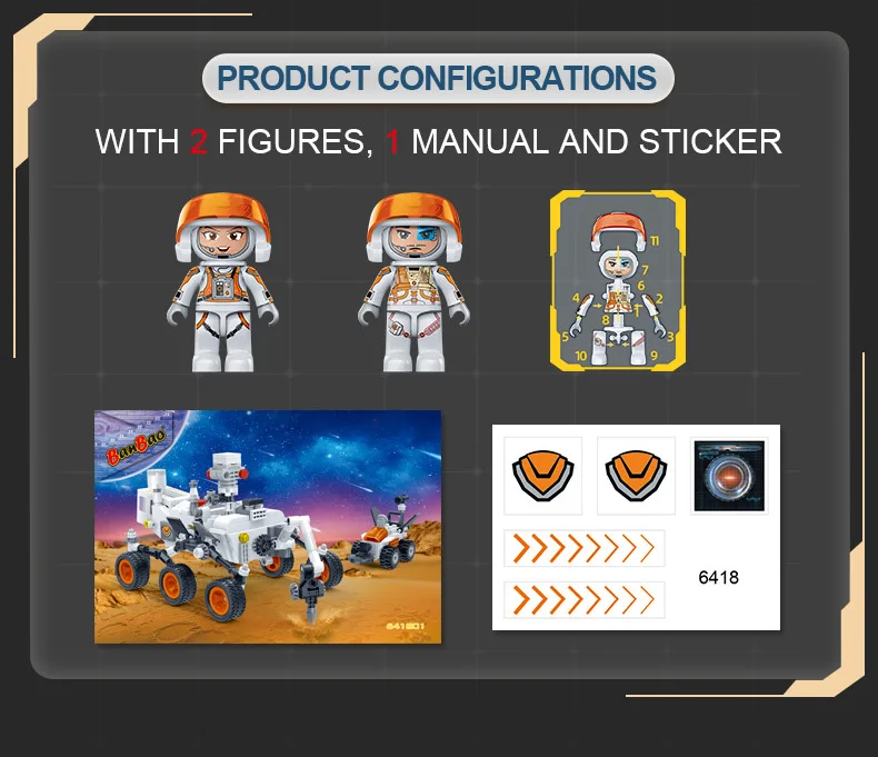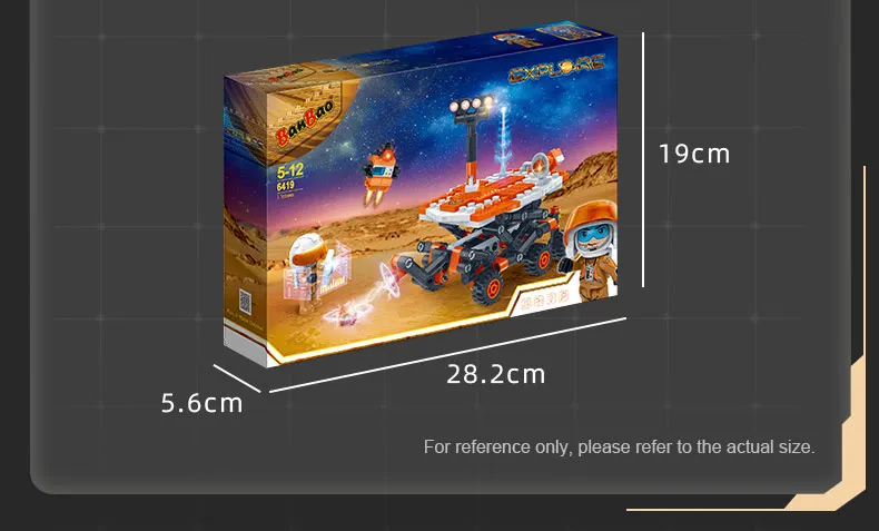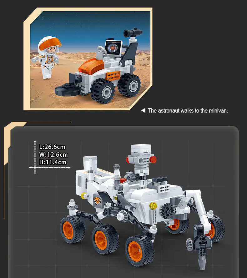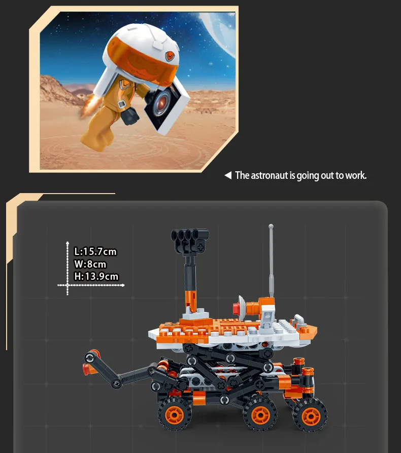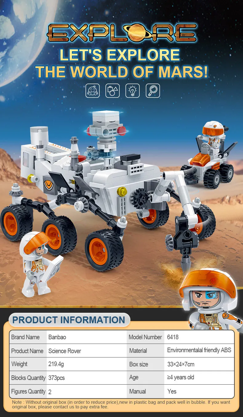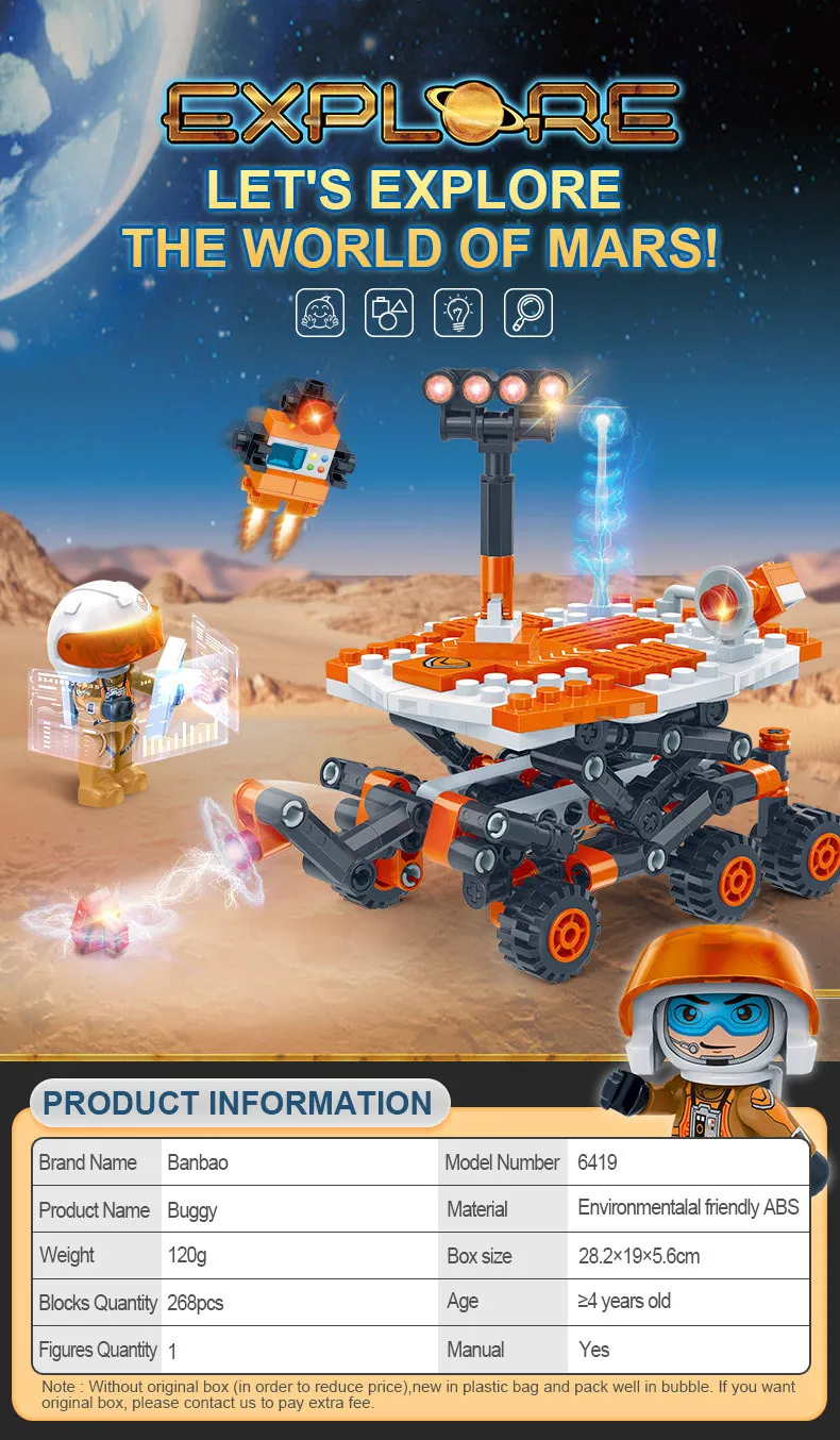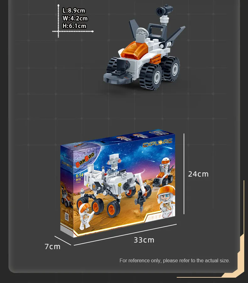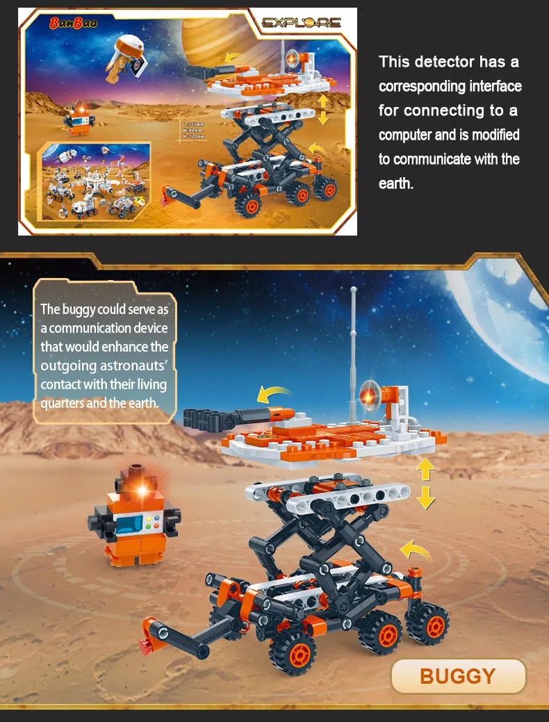 Designer "Space Research" (373 elm.) Mars rover 2 Build your own unique world with the BanBao construction set! This exciting building block toy brings unlimited creativity and possibilities to your home. Each piece has its own specific place, and the step-by-step guide helps you create the perfect character or unusual artifact. From epic battle robots to exciting heroes and incredible worlds, BanBao allows you to turn any idea into into reality. This construction set is not only an entertaining toy, but also a unique opportunity for your child to develop spatial thinking, creativity and logic skills, during which they will enjoy every moment of construction and be proud of their own masterpiece. With BanBao, your possibilities are endless - let your imagination run wild!