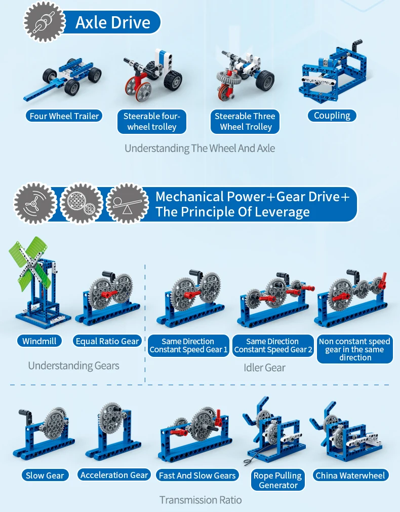 Somatosensory Remote Control Robot(192pcs.) Through the assembling and debugging of the set, learn about the somatosensory remote control function, motor, and other related knowledge, and through the combination of various modules, design the model of the somatosensory remote control football robot with more functions. Realize forward, backward, left turn, right turn, hit the ball, and other functions. This set can simulate a football game: When organizing a somatosensory remote control robot for a football game, when the robot enters the driving mode, it can simulate a football player's dribbling action; when the robot switches to the hit mode, it can perform free throws and penalty kicks.