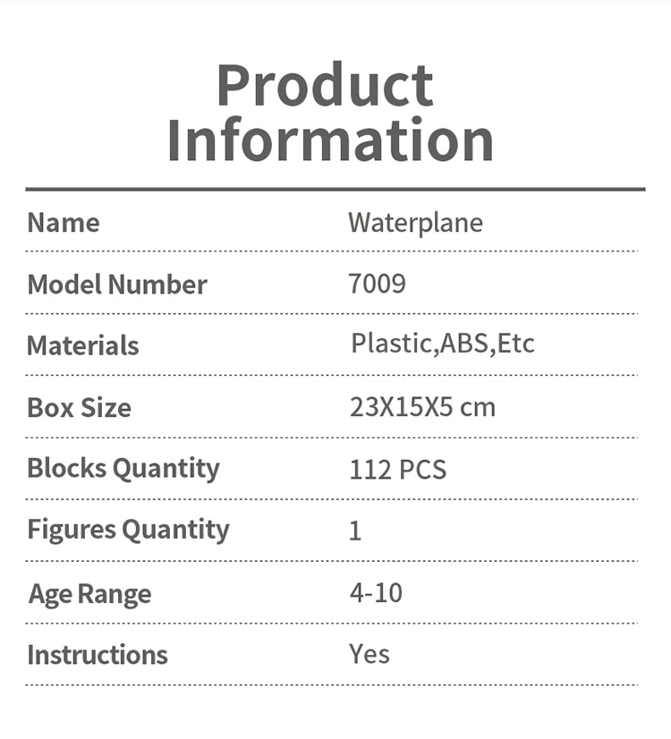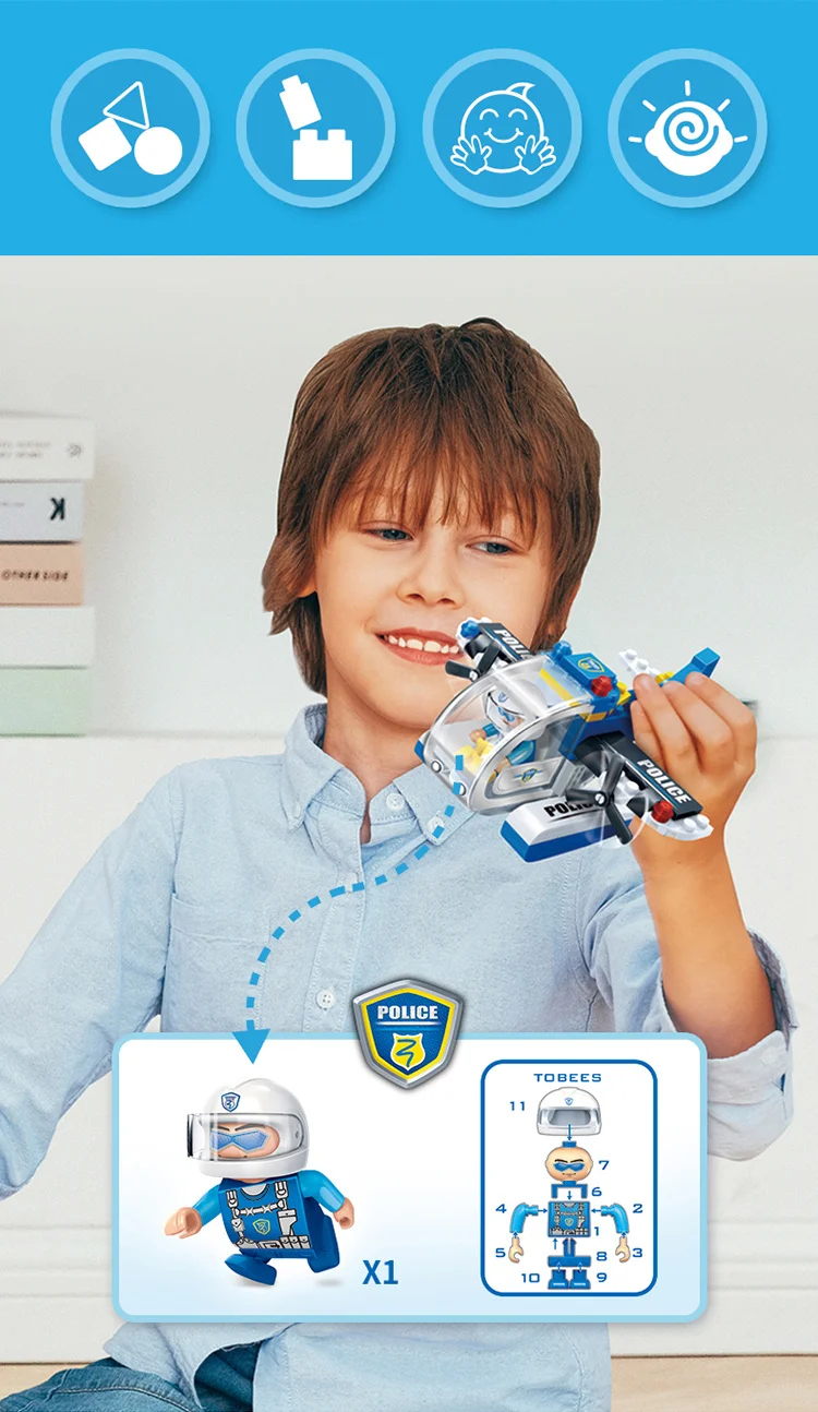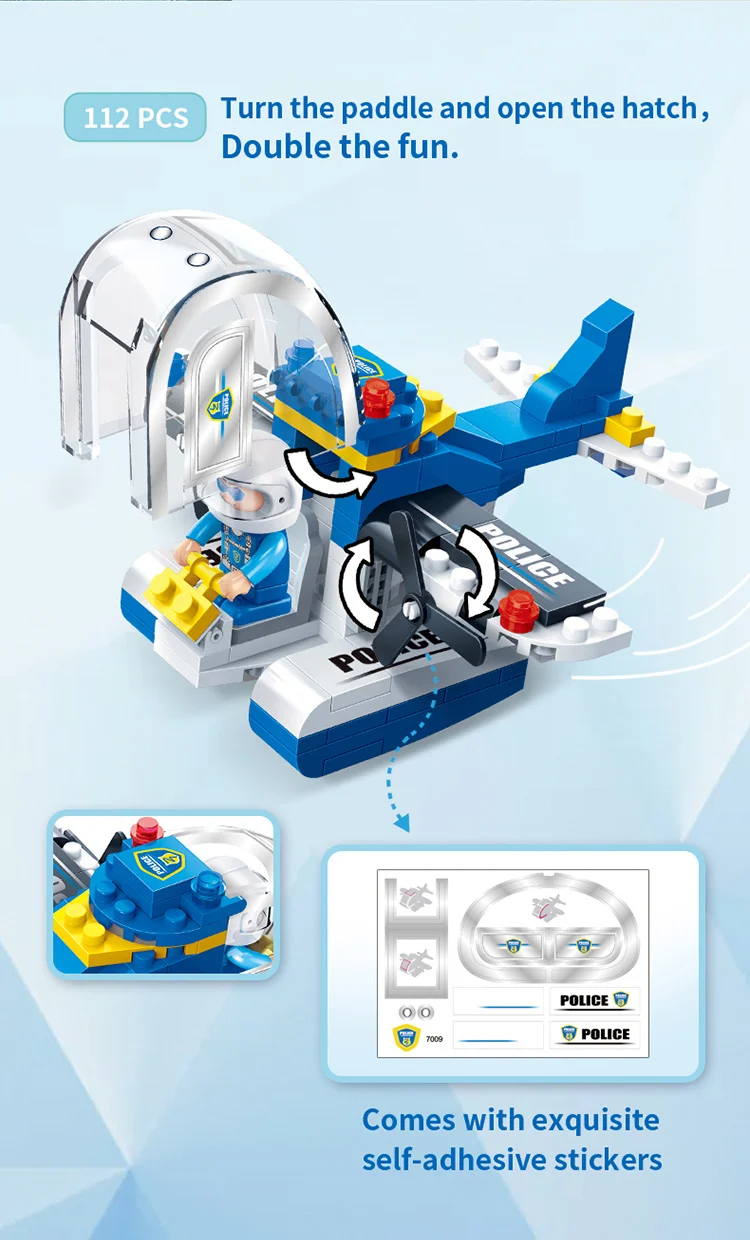 Designer "Police" (112 elm.) Seaplane Build your own unique world with the BanBao construction set! This exciting building block toy brings unlimited creativity and possibilities to your home. Each piece has its own specific place, and the step-by-step guide helps you create the perfect character or unusual artifact. From epic battle robots to exciting heroes and incredible worlds, BanBao allows you to turn any idea into into reality. This construction set is not only an entertaining toy, but also a unique opportunity for your child to develop spatial thinking, creativity and logic skills, during which they will enjoy every moment of construction and be proud of their own masterpiece. With BanBao, your possibilities are endless - let your imagination run wild!