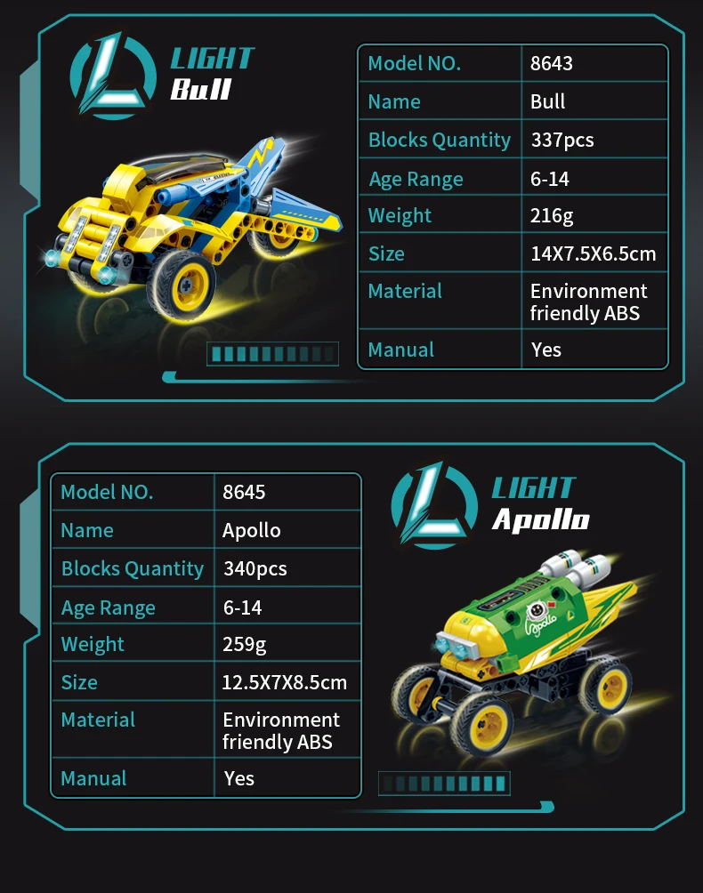 Construction set "Exclusive cars" (337 elm.) Apollo Build your own unique world with the BanBao construction set! This exciting building block toy brings unlimited creativity and possibilities to your home. Each piece has its own specific place, and the step-by-step guide helps you create the perfect character or unusual artifact. From epic battle robots to exciting heroes and incredible worlds, BanBao allows you to turn any idea into into reality. This construction set is not only an entertaining toy, but also a unique opportunity for your child to develop spatial thinking, creativity and logic skills, during which they will enjoy every moment of construction and be proud of their own masterpiece. With BanBao, your possibilities are endless - let your imagination run wild!