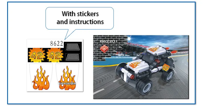 Construction set "Powerful force" (128 pcs) Dragster Build your own unique world with the BanBao construction set! This exciting building block toy brings unlimited creativity and possibilities to your home. Each piece has its own specific place, and the step-by-step guide helps you create the perfect character or unusual artifact. From epic battle robots to exciting heroes and incredible worlds, BanBao allows you to turn any idea into into reality. This construction set is not only an entertaining toy, but also a unique opportunity for your child to develop spatial thinking, creativity and logic skills, during which they will enjoy every moment of construction and be proud of their own masterpiece. With BanBao, your possibilities are endless - let your imagination run wild!