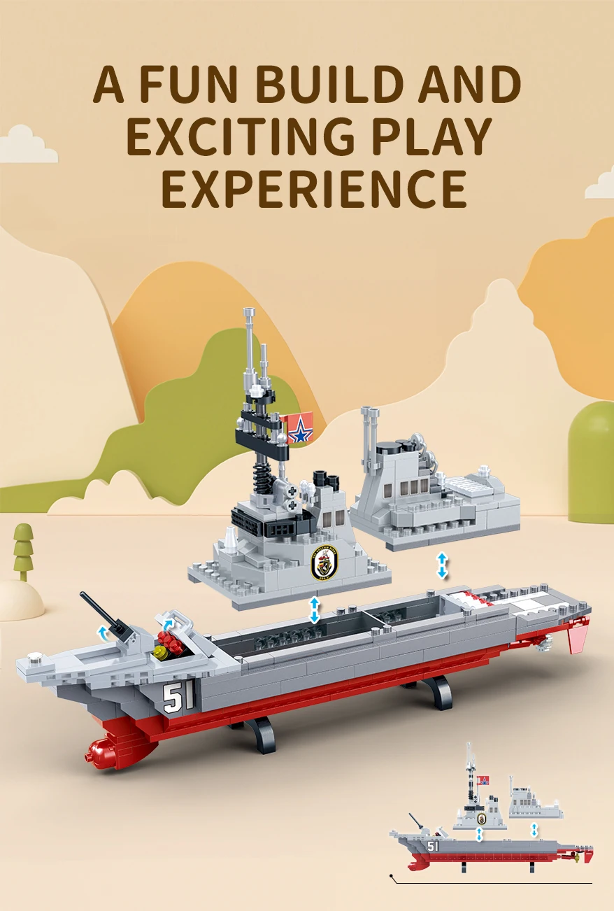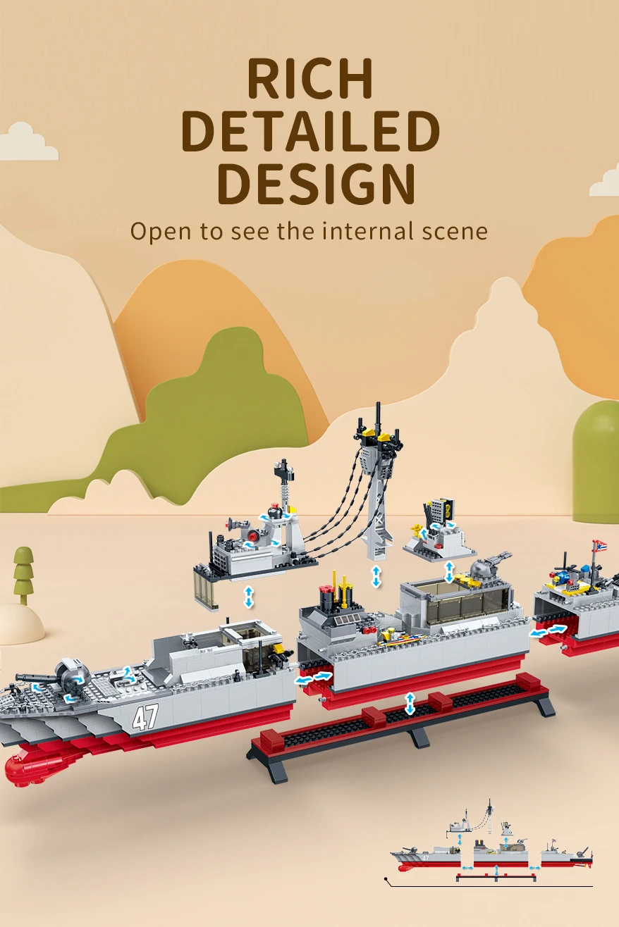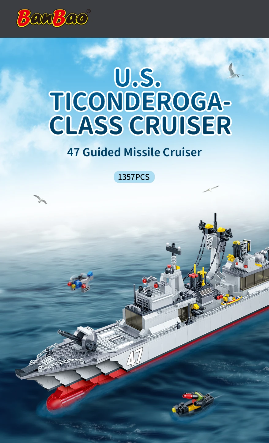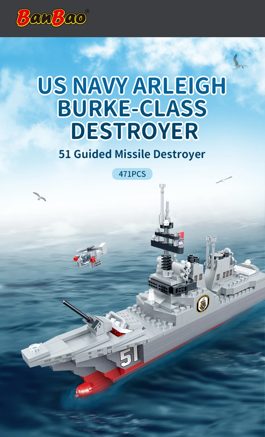 Designer "Fleet" (471 elm.) Destroyer №51 Build your own unique world with the BanBao construction set! This exciting building block toy brings unlimited creativity and possibilities to your home. Each piece has its own specific place, and the step-by-step guide helps you create the perfect character or unusual artifact. From epic battle robots to exciting heroes and incredible worlds, BanBao allows you to turn any idea into into reality. This construction set is not only an entertaining toy, but also a unique opportunity for your child to develop spatial thinking, creativity and logic skills, during which they will enjoy every moment of construction and be proud of their own masterpiece. With BanBao, your possibilities are endless - let your imagination run wild!