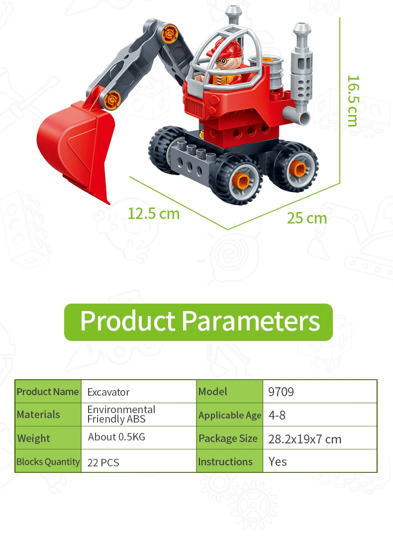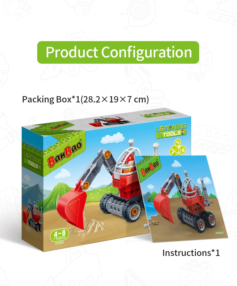 Construction set "Excavator" (22 pieces) Build your own unique world with the BanBao construction set! This exciting building block toy brings unlimited creativity and possibilities to your home. Each piece has its own specific place, and the step-by-step guide helps you create the perfect character or unusual artifact. From epic battle robots to exciting heroes and incredible worlds, BanBao allows you to turn any idea into into reality. This construction set is not only an entertaining toy, but also a unique opportunity for your child to develop spatial thinking, creativity and logic skills, during which they will enjoy every moment of construction and be proud of their own masterpiece. With BanBao, your possibilities are endless - let your imagination run wild!