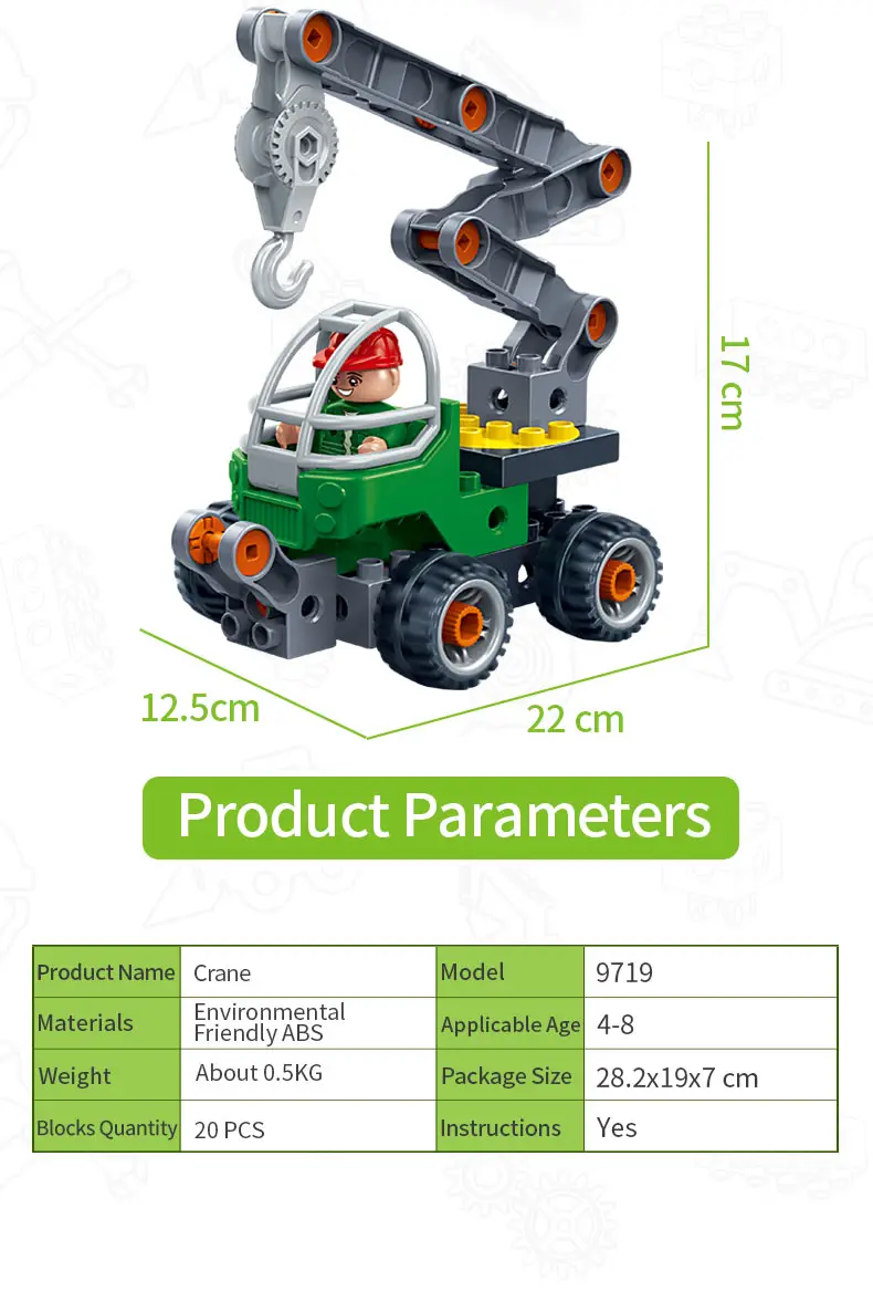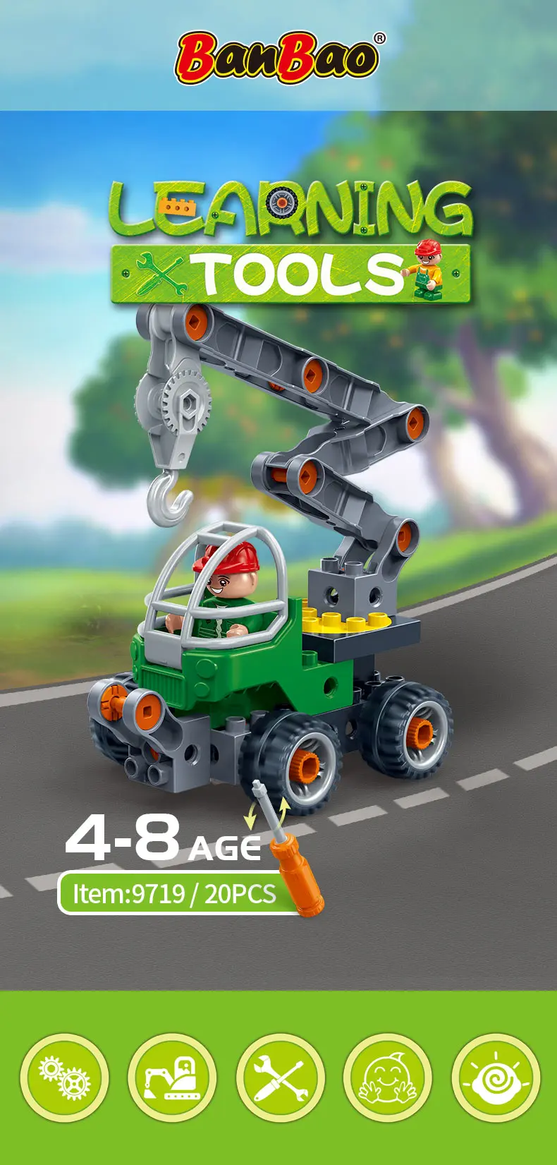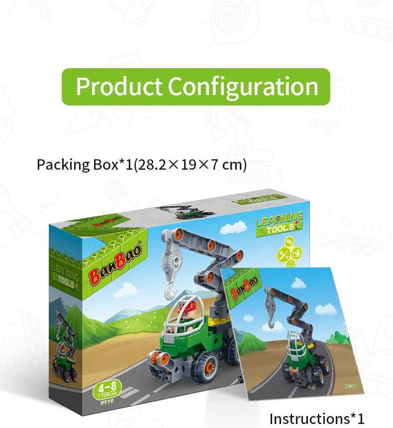 Construction set "Crane" (20 pieces) Build your own unique world with the BanBao construction set! This exciting building block toy brings unlimited creativity and possibilities to your home. Each piece has its own specific place, and the step-by-step guide helps you create the perfect character or unusual artifact. From epic battle robots to exciting heroes and incredible worlds, BanBao allows you to turn any idea into into reality. This construction set is not only an entertaining toy, but also a unique opportunity for your child to develop spatial thinking, creativity and logic skills, during which they will enjoy every moment of construction and be proud of their own masterpiece. With BanBao, your possibilities are endless - let your imagination run wild!