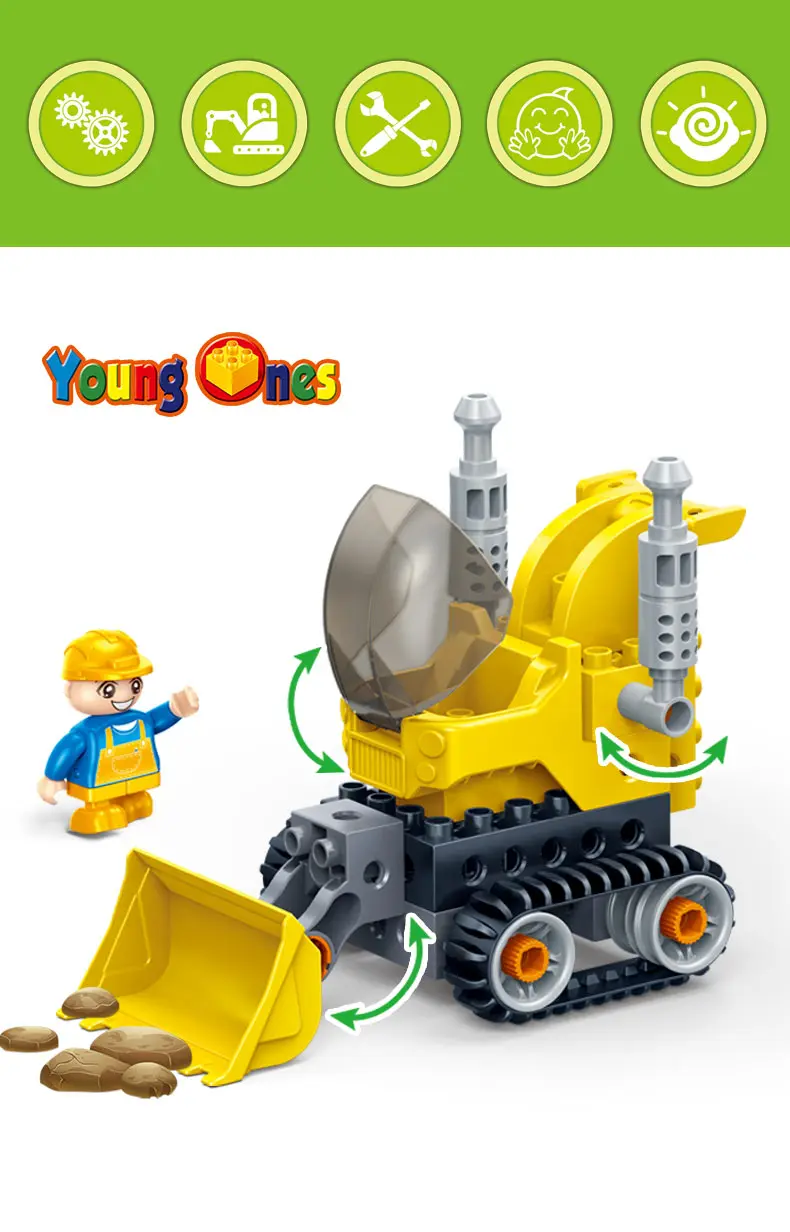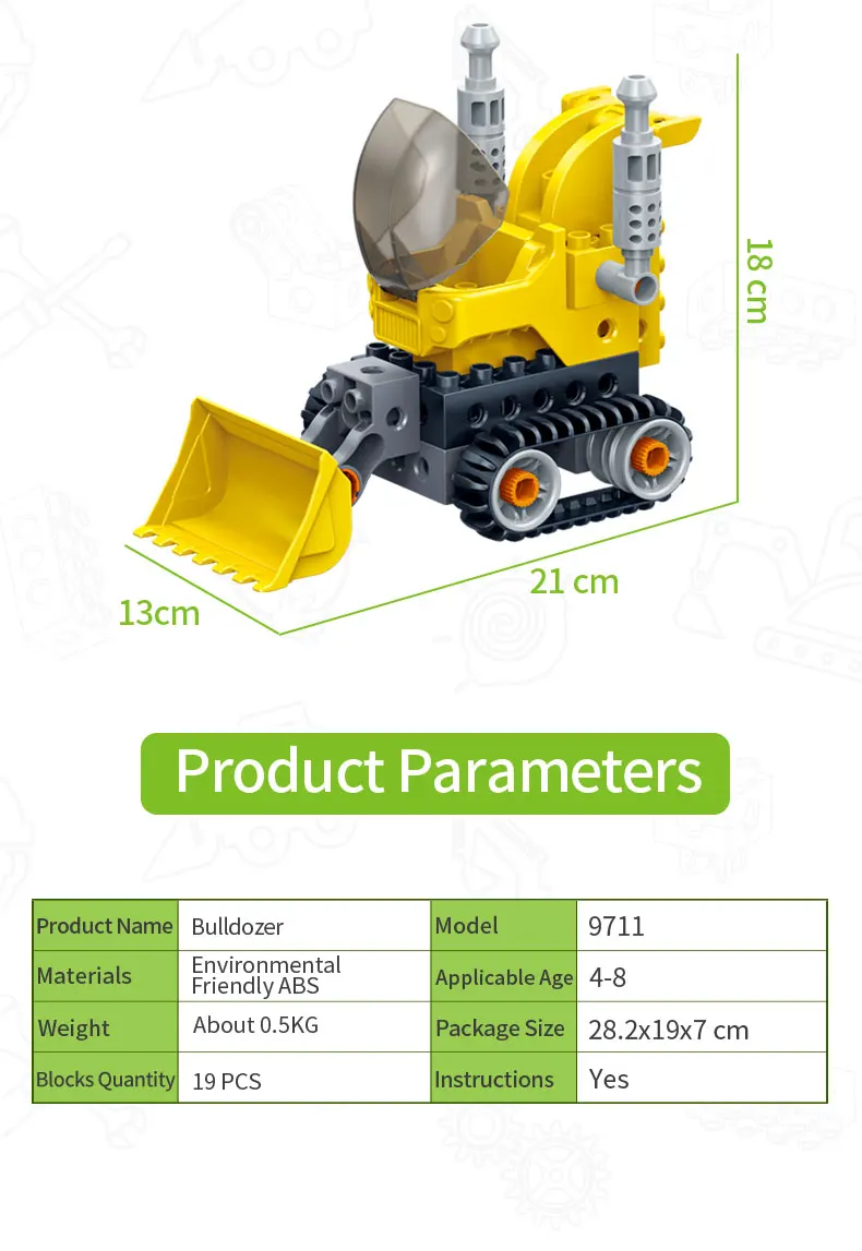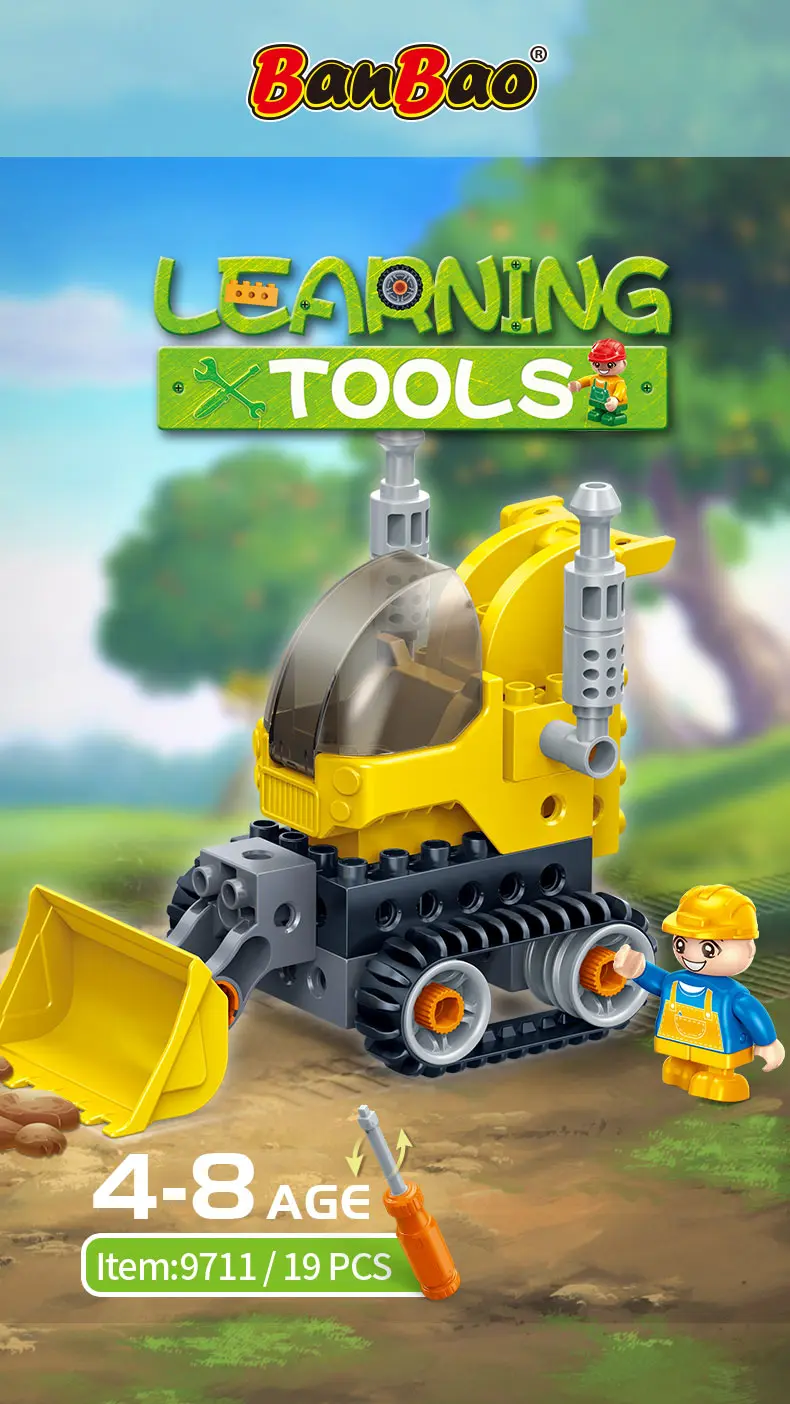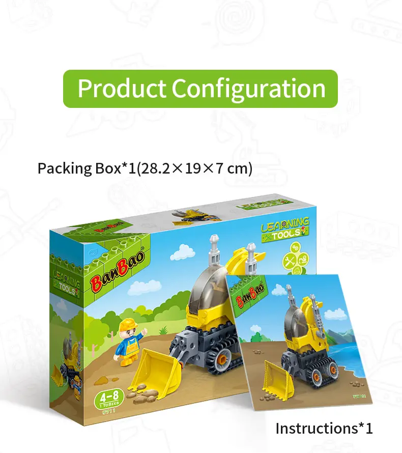 Construction set "Bulldozer" (19 pieces) Build your own unique world with the BanBao construction set! This exciting building block toy brings unlimited creativity and possibilities to your home. Each piece has its own specific place, and the step-by-step guide helps you create the perfect character or unusual artifact. From epic battle robots to exciting heroes and incredible worlds, BanBao allows you to turn any idea into into reality. This construction set is not only an entertaining toy, but also a unique opportunity for your child to develop spatial thinking, creativity and logic skills, during which they will enjoy every moment of construction and be proud of their own masterpiece. With BanBao, your possibilities are endless - let your imagination run wild!