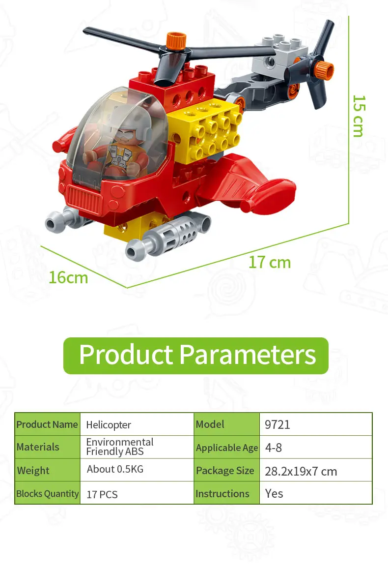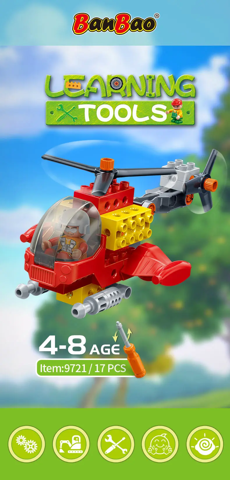Construction set "Helicopter" (17 pieces) Build your own unique world with the BanBao construction set! This exciting building block toy brings unlimited creativity and possibilities to your home. Each piece has its own specific place, and the step-by-step guide helps you create the perfect character or unusual artifact. From epic battle robots to exciting heroes and incredible worlds, BanBao allows you to turn any idea into into reality. This construction set is not only an entertaining toy, but also a unique opportunity for your child to develop spatial thinking, creativity and logic skills, during which they will enjoy every moment of construction and be proud of their own masterpiece. With BanBao, your possibilities are endless - let your imagination run wild!