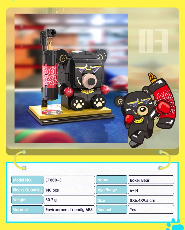 Construction set "Character" (140 pieces) Boxer bear Build your own unique world with the BanBao construction set! This exciting building block toy brings unlimited creativity and possibilities to your home. Each piece has its own specific place, and the step-by-step guide helps you create the perfect character or unusual artifact. From epic battle robots to exciting heroes and incredible worlds, BanBao allows you to turn any idea into into reality. This construction set is not only an entertaining toy, but also a unique opportunity for your child to develop spatial thinking, creativity and logic skills, during which they will enjoy every moment of construction and be proud of their own masterpiece. With BanBao, your possibilities are endless - let your imagination run wild!