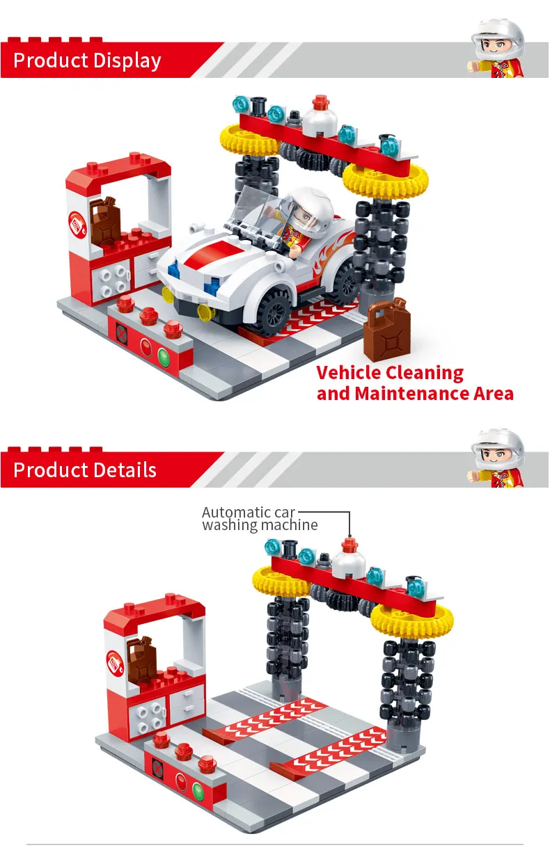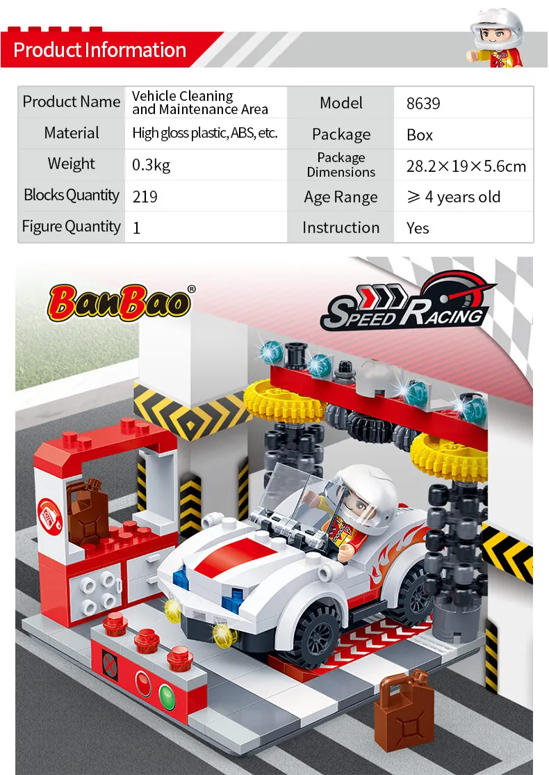 Designer "Speed Race" (219 elm.) Car wash Build your own unique world with the BanBao construction set! This exciting building block toy brings unlimited creativity and possibilities to your home. Each piece has its own specific place, and the step-by-step guide helps you create the perfect character or unusual artifact. From epic battle robots to exciting heroes and incredible worlds, BanBao allows you to turn any idea into into reality. This construction set is not only an entertaining toy, but also a unique opportunity for your child to develop spatial thinking, creativity and logic skills, during which they will enjoy every moment of construction and be proud of their own masterpiece. With BanBao, your possibilities are endless - let your imagination run wild!