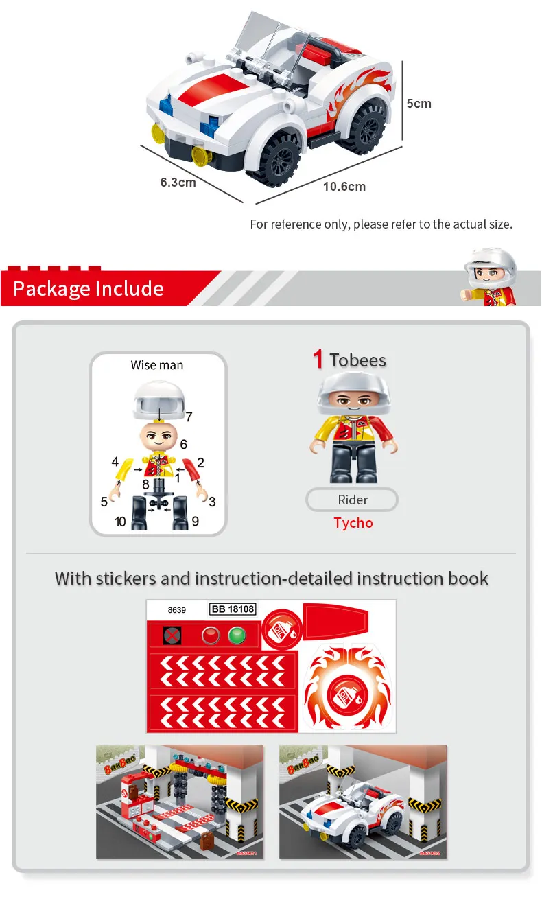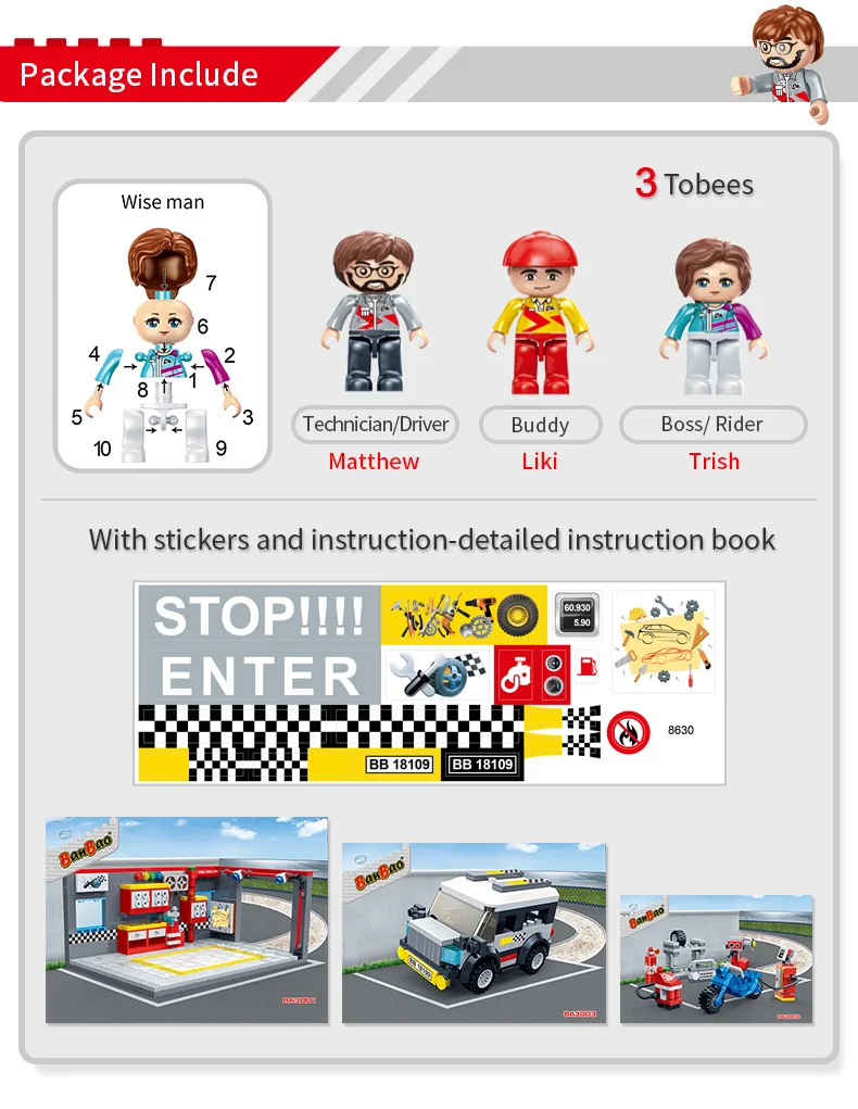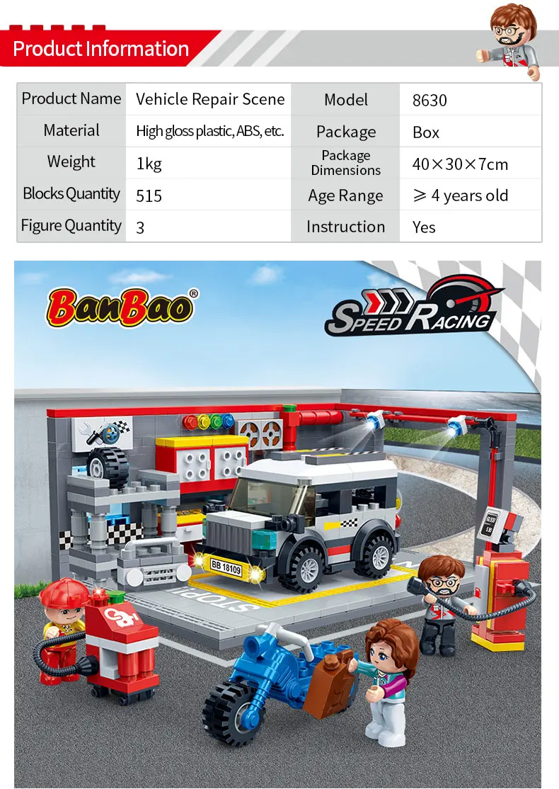 Designer "Speed Race" (515 elm.) Car service Build your own unique world with the BanBao construction set! This exciting building block toy brings unlimited creativity and possibilities to your home. Each piece has its own specific place, and the step-by-step guide helps you create the perfect character or unusual artifact. From epic battle robots to exciting heroes and incredible worlds, BanBao allows you to turn any idea into into reality. This construction set is not only an entertaining toy, but also a unique opportunity for your child to develop spatial thinking, creativity and logic skills, during which they will enjoy every moment of construction and be proud of their own masterpiece. With BanBao, your possibilities are endless - let your imagination run wild!