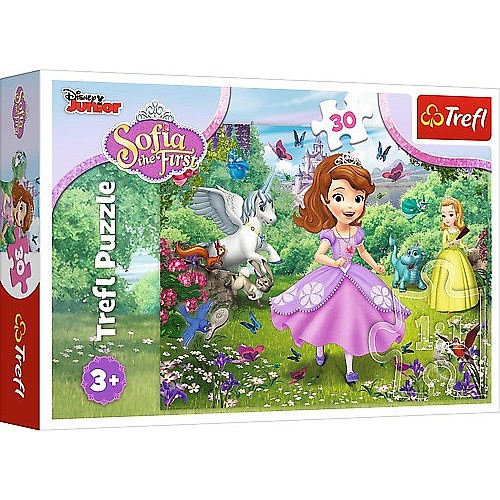 Пазлы - (30 Элм.) - "Прогулка в саду" / Дисней София прекрасная                                                     Пазлы 30 элементов с героями сериала «София Прекрасная». После расстановки будет создана картинка размером 27х20 см. Высокое качество, насыщенность цвета и безопасное составления обеспечивается каландровым светоотражающим бумагой, покрытой экологическими пищевыми красками.  |