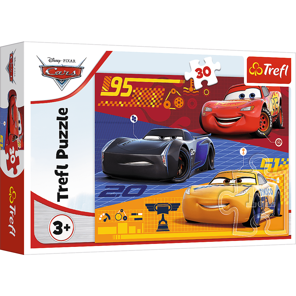 Головоломки - (30 Элм.) - "Тачки перед заездом" / Дисней Тачки                                                     Пазлы на 30 элементов с изображением главных персонажей популярного анимационного фильма Уолта Диснея «Тачки-3", которые тщательно готовятся к гонкам. В сложенном виде размер картинки составляет 20х27 см. Высокое качество, насыщенность цветов и безопасность при составлении пазлов обеспечивает специальный глазури (каландрированный) картон, который отражает свет и покрыт экологическими красками. Предупреждение! Не предназначены для детей в возрасте до 3-х лет. Продукция содержит мелкие детали. Во избежание опасности (проглатывания деталей, всування в носовые или слуховые отверстия), рекомендуется использовать под наблюдением взрослого.