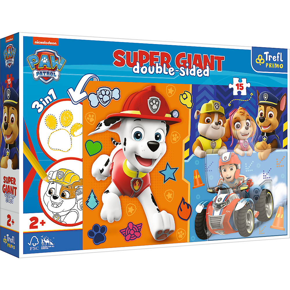 Пазли + розмальовка - (15 елм.SUPER GIANT) - "Маршал та його друзі" Зустріньте собаку патруль - це три ігри в одному продукті! Головоломка з дуже великими елементами буде чудовою з 2 років.Головоломки розділені на 15 елементів, а графіка проста, барвиста з великими формами, завдяки яким діти вдосконалюють свої ручні навички та візуальне сприйняття. На звороті головоломки є дві ігри - розмальовка та проста гра з розмальовками.Гра з Super Giant 15 головоломок допомагає розвивати ручні навички, сприйнятливість та творчість з раннього віку.