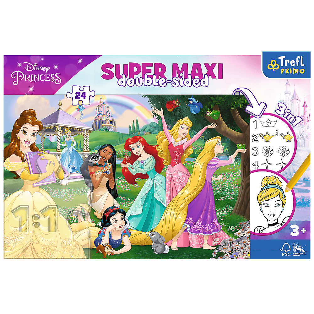 Пазли + розмальовка - (24 елм.SUPER МАХІ) - "Щастливі принцеси" Щасливі принцеси - це три ігри в одному продукті!,Велика подвійна головоломка для маленьких дітей віком від 3 років - ідеально підходить для дітей, які за ними мають менше елементів. Головоломки поділяються на 24 великі елементи. На звороті кожної головоломки є дві ігри - книга -розмальовки та гра з розмальовками - виклик для справжніх розумних!,Головоломка Super Maxi 24 - це поєднання великої забави з радістю незалежного творіння. Є дизайни з улюбленими героями анімаційних фільмів та серіалів для дітей. ,,