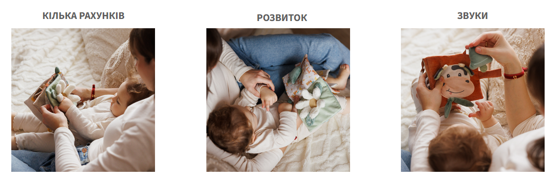 Розвиваюча м'яка книжечка "Морський Світ"/"Babyono" Сенсорна книжка 'Морський світ' відкриє вашій дитині захоплюючий підводний світ. Стимулює сенсорний розвиток малюка з перших днів життя. Різноманітні матеріали та текстури стимулюють відчуття дотику. Такі тканини, як фетр, м'які та безпечні. Вони залишаються міцними навіть під час інтенсивної гри. Знімні липучки та приховані елементи пробуджують цікавість дитини та заохочують до самостійних досліджень. Вони розвивають концентрацію уваги та логічне мислення. БАГАТО ФАКТУРВикористання різних способів поєднання матеріалів і текстур створило незвичайний мікс тактильних відчуттів, заохочуючи малюка до дослідження. СЕНСОРНІ ТКАНИНИНаявність фетрових елементів не тільки додає унікального характеру, але й гарантує довговічність та безпеку під час інтенсивної гри. РОЗВИТОК ЗОРУПриродна та приглушена кольорова гама створює цікаве місце для зустрічі з тваринами. ІНТЕРАКТИВЕлементи на липучках можна прикріплювати та від'єднувати, розвиваючи таким чином відчуття дотику та координацію рухів. ПОВНИЙ СЮРПРИЗІВУ книжці багато прихованих елементів, які чекають на те, щоб їх відкрив малюк: рибка ховається за сіткою, морська зірка - за водоростями. ВІДПОВІДНИЙ РОЗМІРКнижка ідеально підходить для маленьких рученят, що робить її ідеальним компаньйоном для вашої дитини. ПРАКТИЧНИЙ ВІШАКДо нашого буклету додається практичний вішак, який дозволяє легко прикріпити його, наприклад, до дитячого ліжечка, коляски або автокрісла. Матеріал: поліестер Вік дитини: 0 м+. |