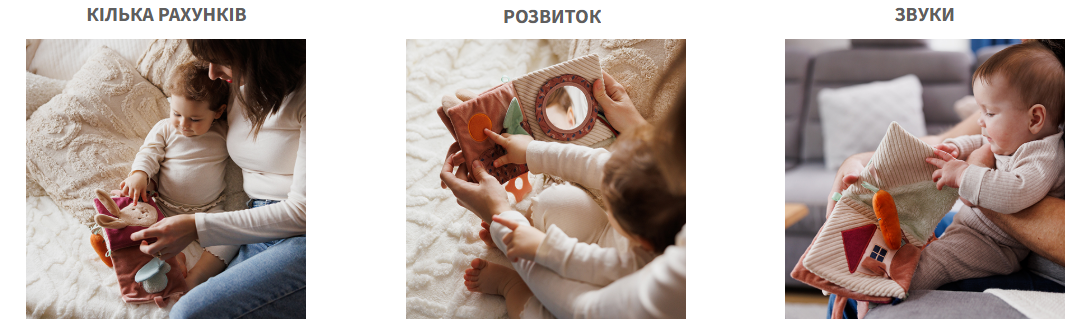 Розвиваюча м'яка книжечка "Кролик Каро" (15*15см) /"Babyono" М’яка сенсорна книжка "Кролик Каро" перенесе малечу на барвисту галявину, де на неї чекає багато сюрпризів.Це чудова інтерактивна іграшка для немовлят, яка розвиває їхні відчуття та дрібну моторику. Приємні матеріали та різноманітні текстури заохочують до дослідження, а цікаві форми пробуджують уяву та стимулюють зір. Захоплива книжка має шелестячі елементи, які видають цікаві звуки при натисканні, брязкальце - яке хочеться потрусити та дзеркальце для пошуку власного відображення. Барвисті стрічки допомагають розвивати хапальний рефлекс. Іграшку можна повісити на ліжечко, коляску або автокрісло. Це чудова розвага та навчання одночасно!