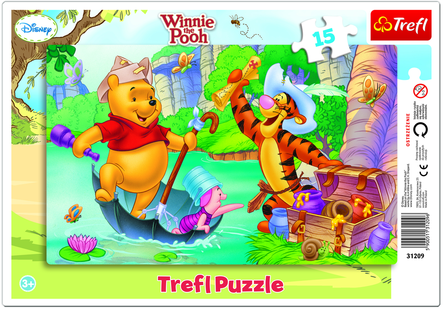 Пазли - (15 елм. Рамкою) - "Вперед за скарбами" / Дісней: Віні Пух Пазли для маленьких дітей з веселою графікою з Вінні-Пухом та його друзями. Пазли містять 15 елементів, розміщених у декоративній, графічно узгодженій рамці, утворюючи дуже гарне ціле з малюнком. Виразні кольори та простий візерунок ідеально підходять віку та майстерності дитини. Після складання буде створено гарну картину Вінні-Пуха, Тигра та Поросята під час пошуку скарбів. |