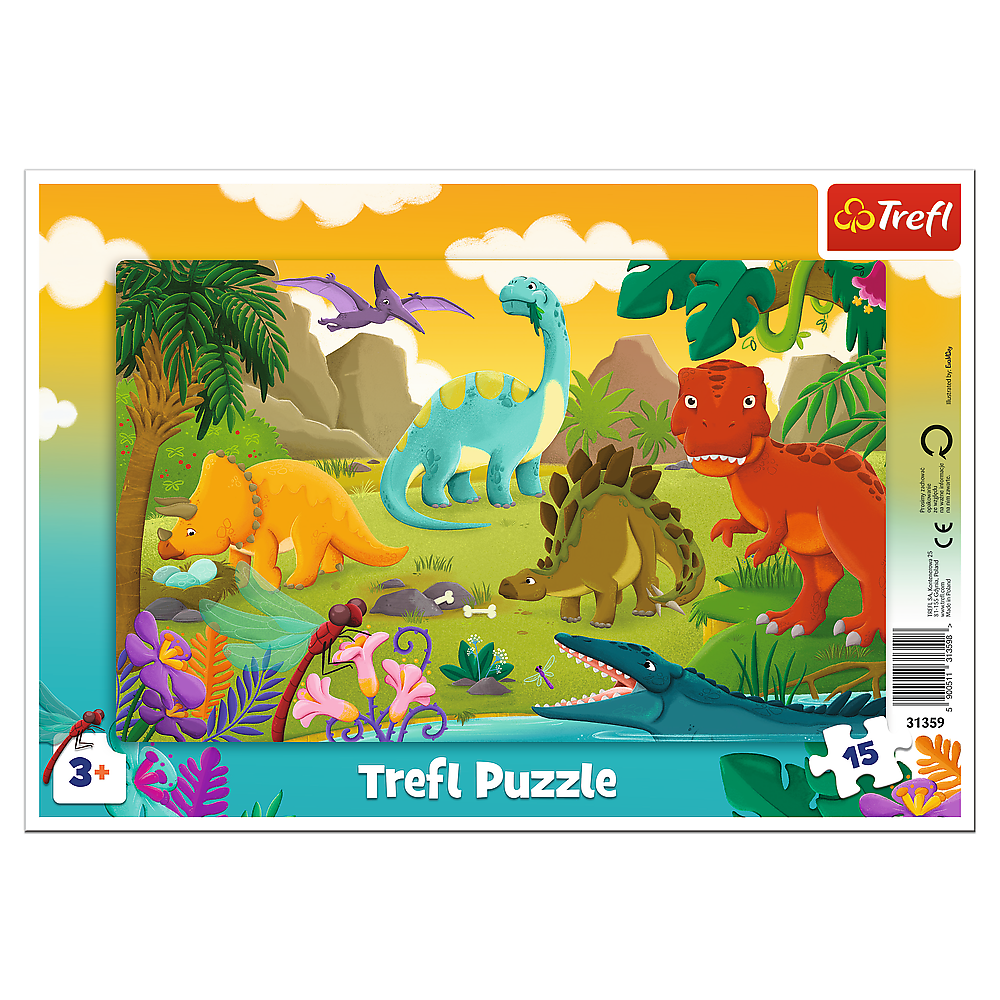 Пазли - (15 елм. Рамкою) - "Динозаври" Навчальні пазли для дітей молодшого віку з динозаврами. Пазл складається з 15 елементів, поміщених в декоративну рамку, утворюючи дуже гарну цілу картинку. Виразні кольори і простий візерунок ідеально підходять навичкам дитини.