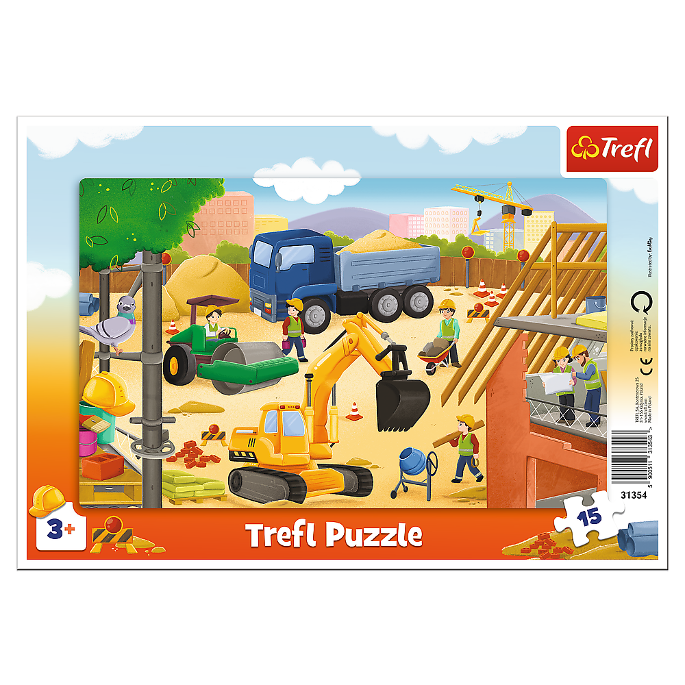 Пазли - (15 елм. Рамкою) - "На будівництві" Пазли складаються з 15 елементів із зображенням барвистих сценок з будівельного майданчика. Елементи поміщені в декоративну графічну рамку, яка утворює разом із зображенням єдине ціле. Крім цього, ця рамка допомагає маленьким діткам зібрати картинку і дозволяє легко переносити її з місця на місце, завдяки чому дитина може самостійно прикрасити свою кімнату. У даних пазлах, які розвивають у дітей рахункові навички, вміння розпізнавати кольори та надають знання про навколишній світ, використані довговічні матеріали та спеціальний світловідбиваючий папір, які гарантують безпеку складання та веселощів.