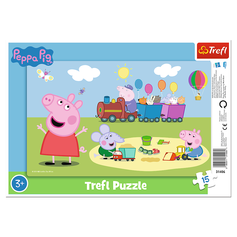 Пазли - (15 елм. Рамкою) - "Веселий потяг" / Веселе поросятко Пазл в рамці, що складається з 15 елементів, призначений для всіх шанувальників Свинки Пеппи. Після складання пазла вийде картинка розміром 258х159 мм.Рамка, в яку вкладено пазли, полегшує дітям молодшого віку розставляти малюнок і дозволяє безпечно носити пазл, завдяки чому ми легко можемо прикрасити ним кімнату.