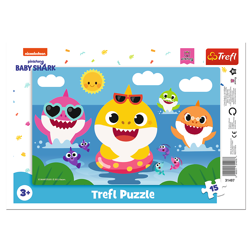 Пазли - (15 елм. Рамкою) - "Веселі акули" / Маленька акула Пазл в рамці, що складається з 15 елементів, створений для всіх шанувальників Baby Shark. Після складання пазла вийде картинка розміром 258х159 мм.Рамка, в яку вкладено пазли, полегшує дітям молодшого віку розставляти малюнок і дозволяє безпечно носити пазл, завдяки чому ми легко можемо прикрасити ним кімнату. |