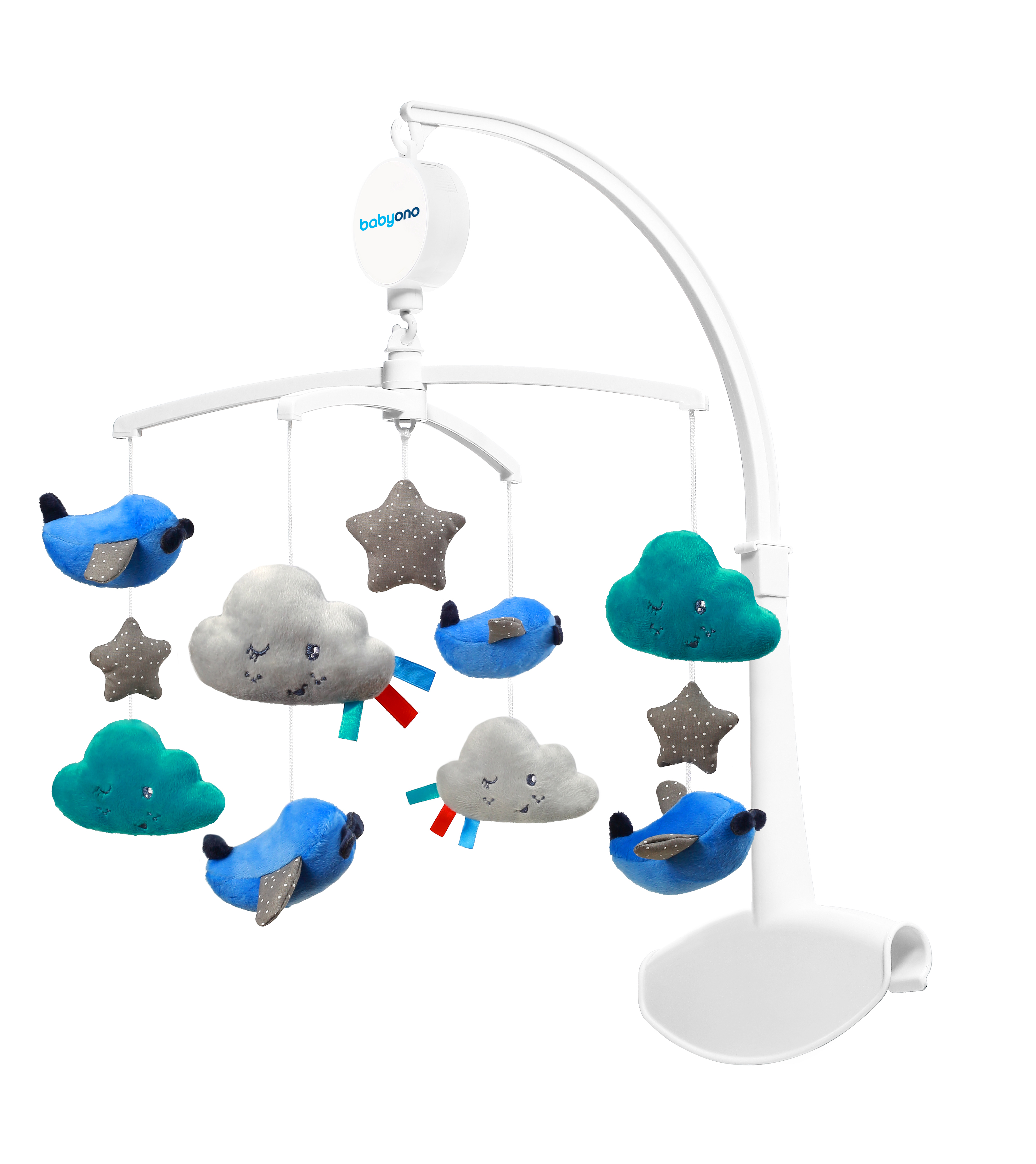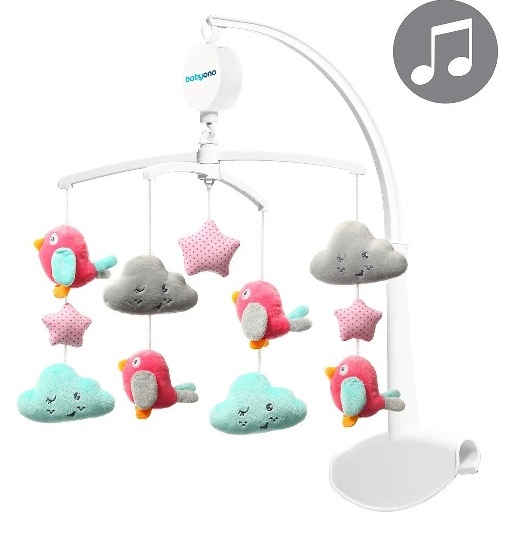 Музична карусель "Хмаринки та пташенята" "BabyOno" Ця універсальна каруселька - це ідеальний продукт, який допомагає вашій дитині легко заснути. Барвисті птахи та привітні хмаринки привернуть увагу дитини, а звук музичної скриньки допоможе їй заспокоїтися. За допомогою спеціально розробленого тримача мобільний можна прикріпити до дорожнього або дерев’яного ліжечка.