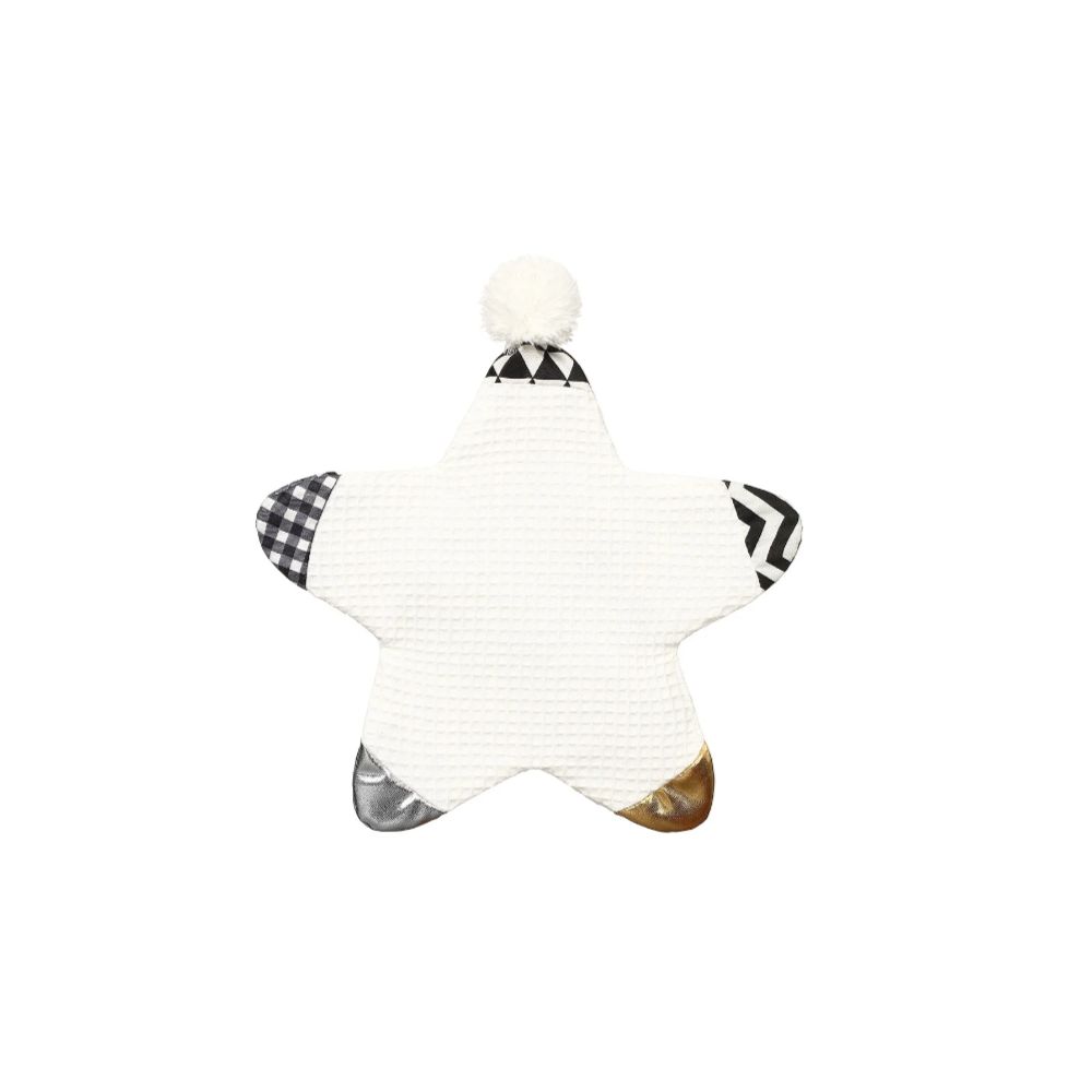 Обіймашка з шурхотінням для малюків "Усміхнена зірочка" (20*20 см) НОВИНКА !!! "BabyOno" Усміхнена зірочка - це приємна іграшка для вашого чудового малюка та частина колекції BLINK & SMILE, створена для дітей та їх батьків. Іграшка ідеально підходить для присідання, штовхання, кусання, притягування уваги, соковитих поцілунків, обіймів і сну. BLINK & SMILE - заклик до мами і тата - посміхніться! У певних ситуаціях достатньо показати язика, а для дитини це означає посилення позитивних емоцій - радості, посмішки та усмішки назад. Золоті та срібні елементи ідеально поєднуються з чорно-білими кольорами, привертаючи увагу дітей, допитливих до світу з перших днів життя. Важливим для розвитку зосередженості уваги дітей та здатності бачити різні предмети є колір. Протягом перших 3 місяців життя новонароджена дитина бачить чорно-білі предмети лише в безпосередній близькості. Лише в найближчі місяці він починає бачити і розпізнавати кольори; у віці 12 місяців зображення вже чітке і барвисте, але повний розвиток зору досягається, коли дитині виповниться 2 роки. Пізнавальну цінність надають різні фактури матеріалів: пухнастий і оксамитовий помпон, плавний і контрастний малюнок, м’яке, прохолодне і блискуче покриття, що видає звук при натиранні рукою. Вся композиція доповнена натуральною бавовняною тканиною.