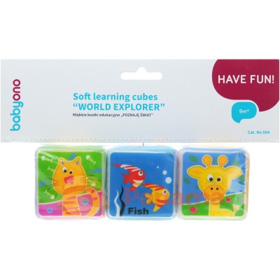 Розвиваючі кубики "Я пізнаю світ"(5 х 5 см)"BabyOno" Набір навчальних кубиків MINI включає три м'яких, різнокольорових кубика, кожен з яких прикрашений різними зображеннями тварин. Невеликий розмір кубиків ідеально підходить для маленьких рук дитини. Кубики - чудова допомога в навчанні слів і кольорів, вони також допомагають вдосконалити навички роботи вручну. Кубики ідеально підходять для укладання та нанизування. Кубики виготовлені з безпечних, міцних і нетоксичних матеріалів. ВЛАСТИВОСТІ:
