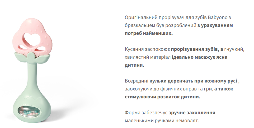 Прорізувач для зубів розвиваючий з брязкальцем "Полуничка"/"Babyono"