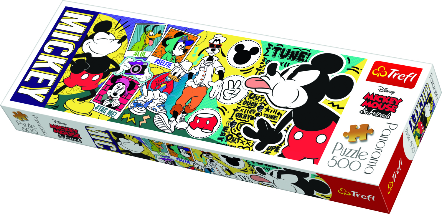 Пазли - (500 елм.) Панорама - "Легендарний Міккі Маусі", Колаж Панорамний пазл з 500 деталей, що зображає Легендарного Міккі Мауса. Після складання буде створена картинка розміром 660 х 237 мм. Виріб виготовлено з якісних матеріалів із застосуванням спеціального каландрового світловідбиваючого паперу, який полегшує складання. |