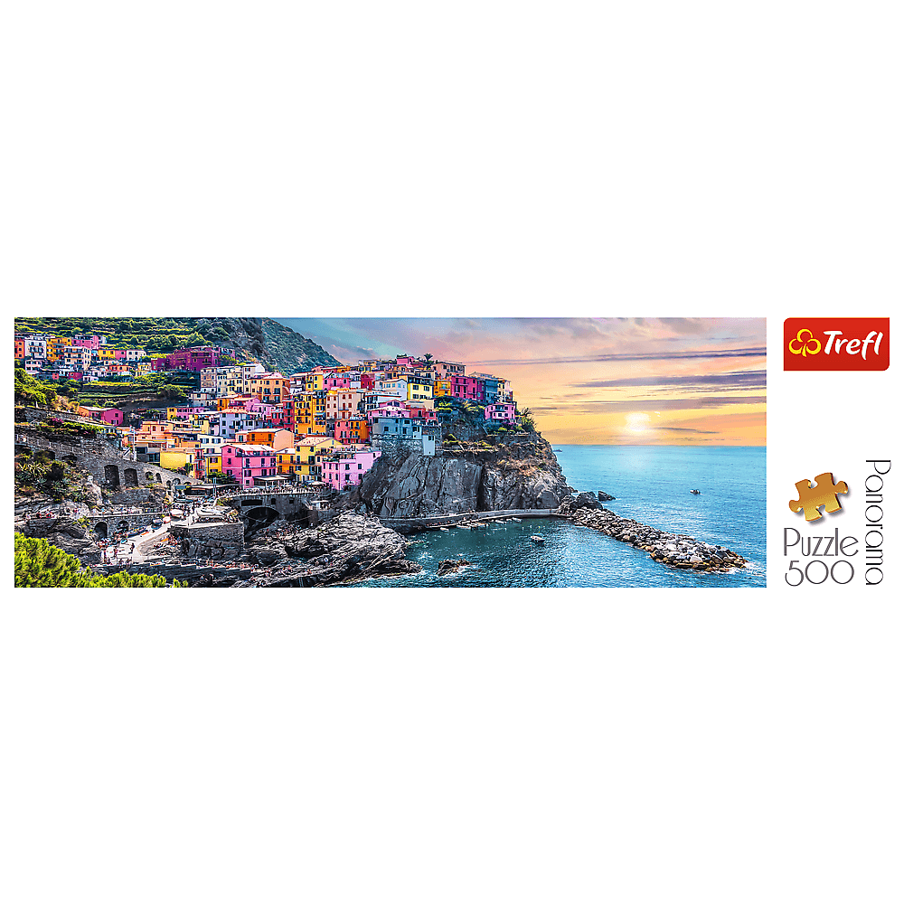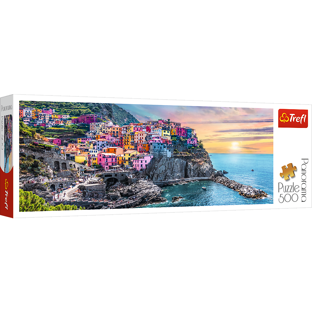 Пазли - (500 елм.) Панорама - "Вернацца на заході сонця" Італія /Trefl Панорамний пазл із зображенням італійського міста Вернацца на заході сонця на 500 елементів . Після аранжування буде створено малюнок розміром 660 х 237 мм. Виріб виготовлено з високоякісних матеріалів, з використанням спеціального каландрового світловідбиваючого паперу, що полегшує укладання.