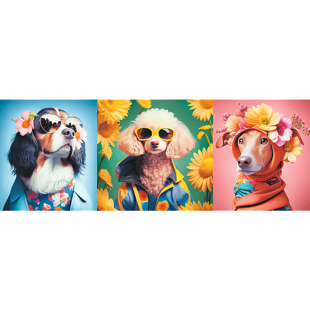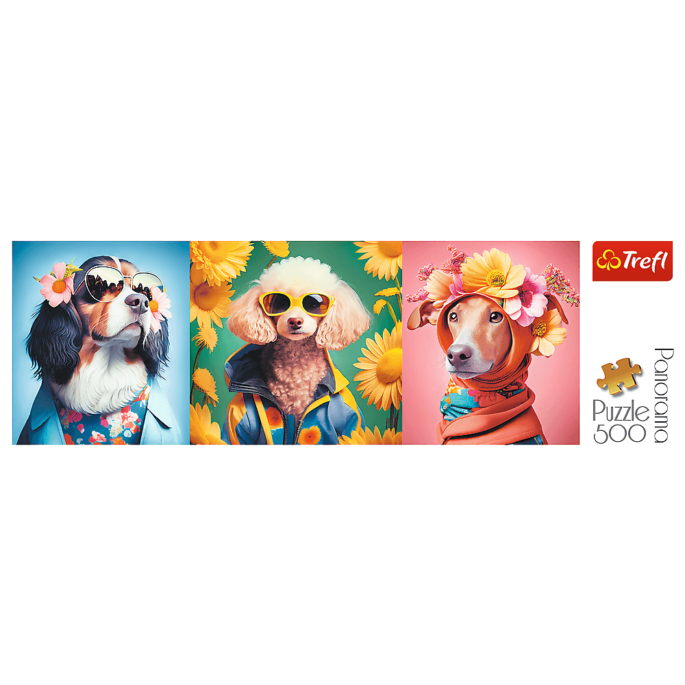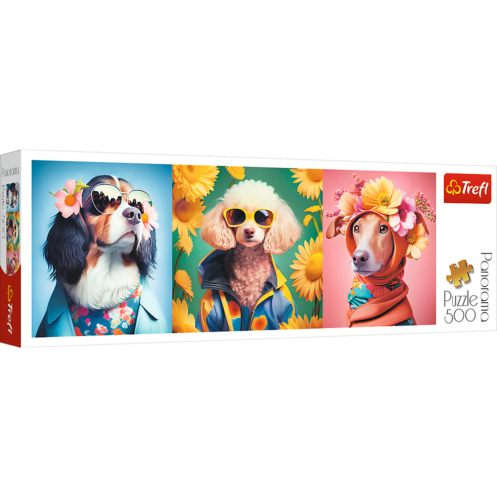 *Пазли - (500 елм.) Панорама - "Собачий тиждень моди" /Trefl Панорамний пазл із зображенням елегантно одягнених собак на 500 елементів . Після аранжування вийде картина розміром 660 х 237 мм. Виріб виготовлено з високоякісних матеріалів, з використанням спеціального каландрового паперу, який відбиває світло, що полегшує його компонування.