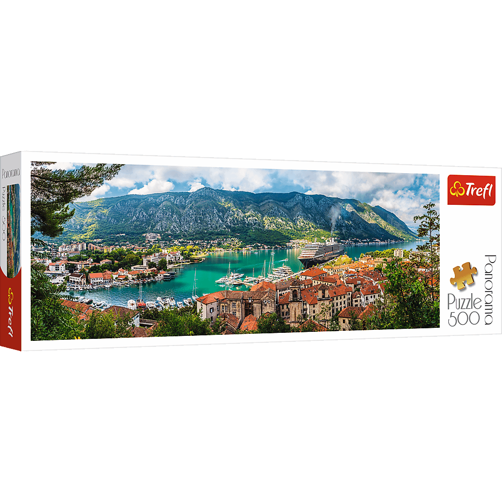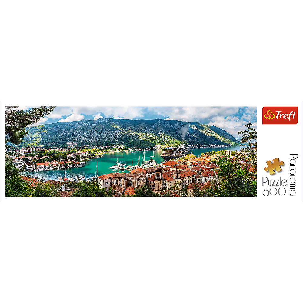 Пазли - (500 елм.) Панорама - "Котор" Чорногорія Панорамний пазл з 500 деталей, що зображає Чорногорський Котор. Після складання буде створена картинка розміром 660 х 237 мм. Виріб виготовлено з якісних матеріалів із застосуванням спеціального каландрового світловідбиваючого паперу, який полегшує складання.