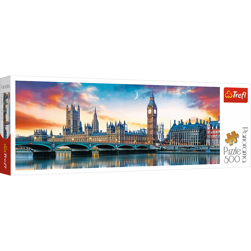 Пазли - (500 елм.) Панорама - "Біг - Бен" Лондон Панорамний пазл з 500 деталей, що зображає Лондонський Біг - Бен. Після складання буде створена картинка розміром 660 х 237 мм. Виріб виготовлено з якісних матеріалів із застосуванням спеціального каландрового світловідбиваючого паперу, який полегшує складання.