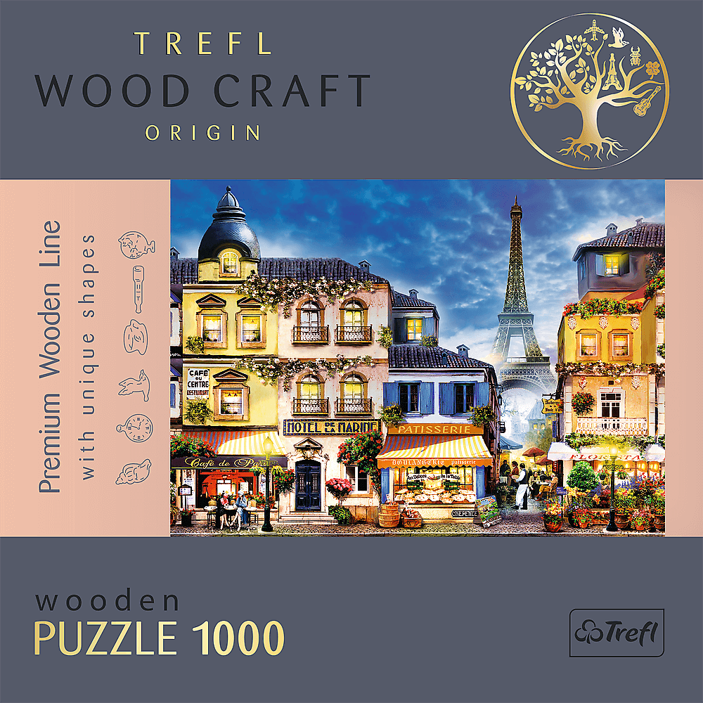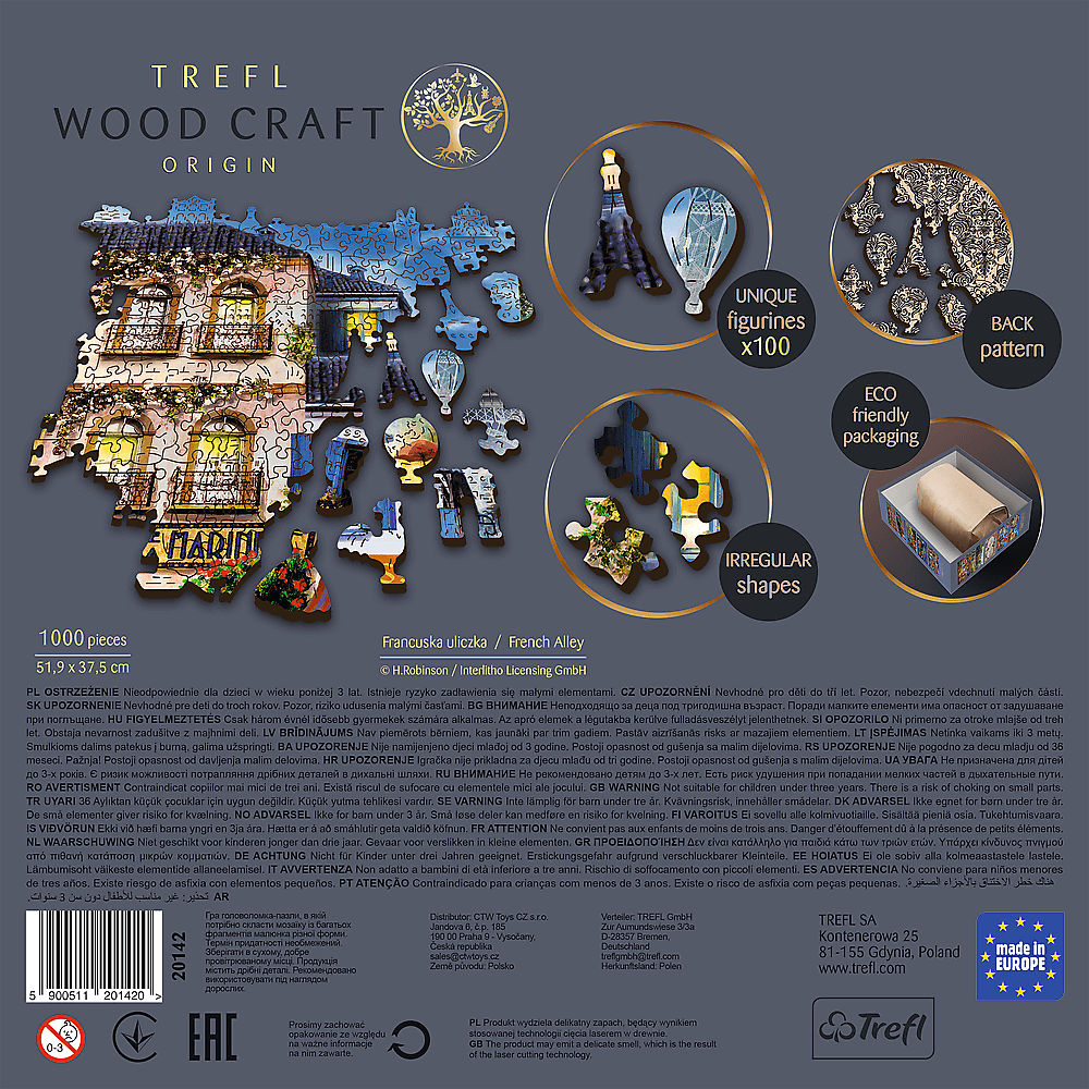 Пазли фігурні з дерева 1000 елм. "Французька алея" Серія пазлів на 1000 елементів ідеально підходить для всіх любителів пазлів, вона дозволить створити картину розміром 51,9 х 37,5 см, на якій зображено алею Франції.Пазл виготовлений з дерева, екологічно чиста упаковка повністю з картону.Пазли містять неправильні частини та 100 фігур у формі тварин.Пазл можна також складати на зворотню сторону. Складніший варіант головоломки, тому що нанесений чорно-білий орнамент.