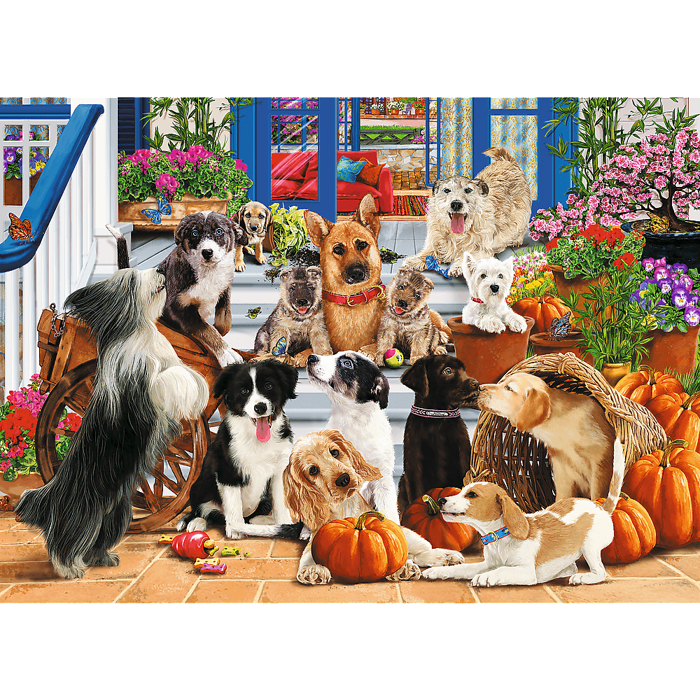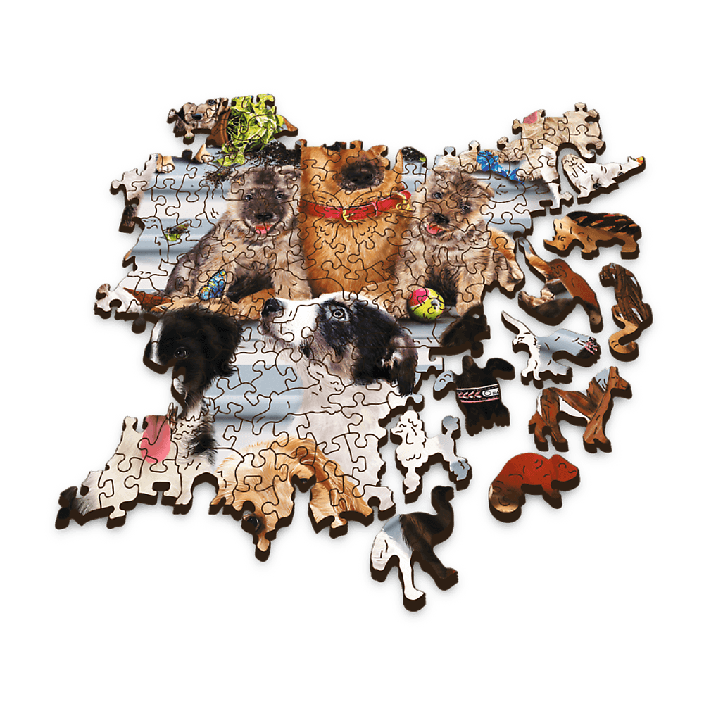 Пазли фігурні з дерева - (1000 елм.) - "Собача дружба" Серія пазлів на 1000 елементів ідеально підходить для всіх любителів пазлів, вона дозволить створити картину розміром 51,9 х 37,5 см, на якій зображено собача дружня команда.Пазл виготовлений з дерева, екологічно чиста упаковка повністю з картону.Пазли містять неправильні частини та 100 фігур у формі тварин.Пазл можна також складати на зворотню сторону. Складніший варіант головоломки, тому що нанесений чорно-білий орнамент.