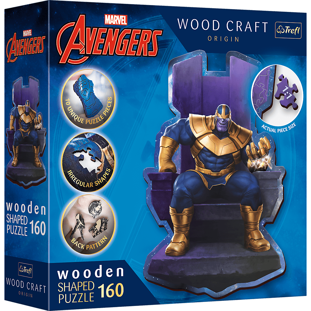 *Пазли фігурні з дерева - (160 елм.) - "Месники - Танос на троні" / Trefl Дерев'яний пазл "Танос на троні" - унікальна пропозиція для любителів Месників . Ці атмосферні головоломки складаються зі 160 елементів , включаючи 10 унікальних фігурок пазлів, що відносяться до всесвіту Marvel. Пазл виготовлений з дерева, а упаковка виготовлена з екологічно чистого картону.Пазли створені для всіх шанувальників головоломок, які шукають нових випробувань і для тих, хто шукає цікавий спосіб відпочити.