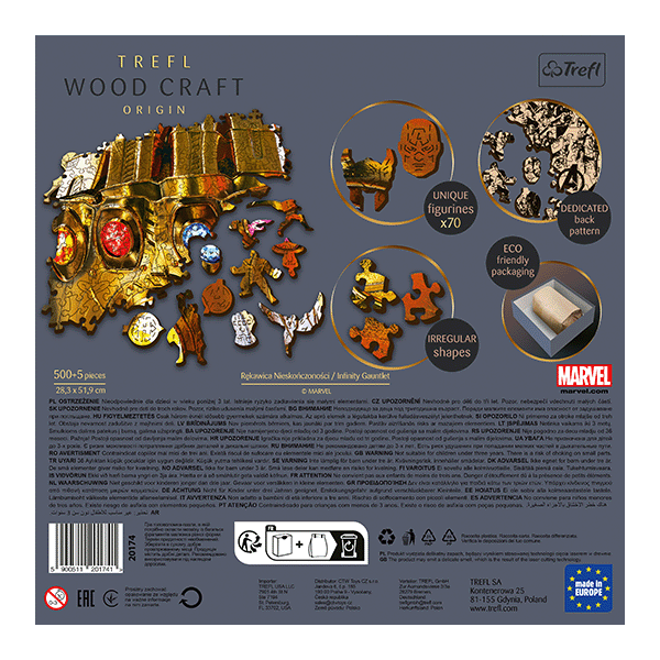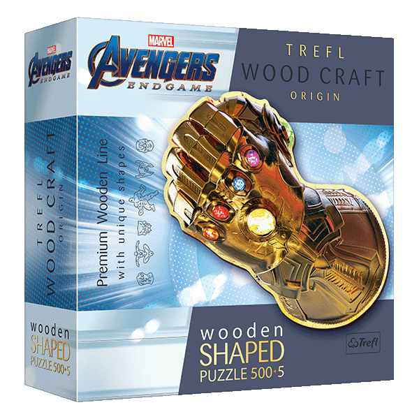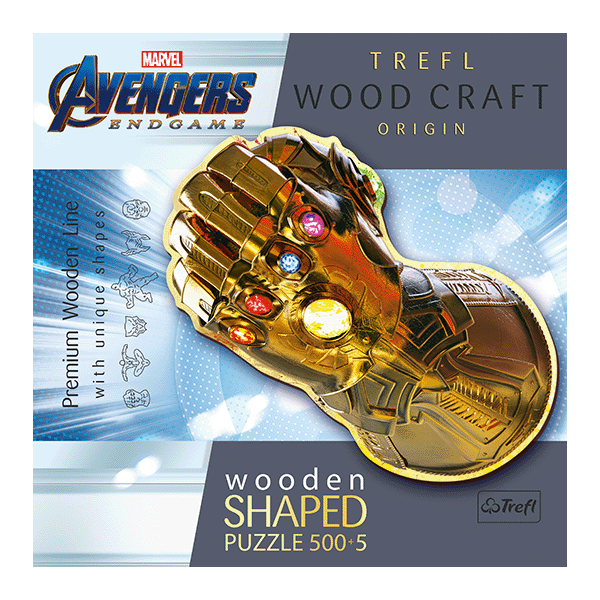 Пазли фігурні з дерева - (500 + 5 елм.) - "Рукавиця нескінечності" Серія дерев'яних пазлів, що складається з 500 + 5 елементів, ідеально підходить для всіх любителів головоломок! Після аранжування буде створено малюнок розміром 28,3 х 51,9 см із зображенням Рукавиці нескінченності. Пазл виготовлений з дерева, а екологічно чиста упаковка повністю виготовлена з картону. Пазли містять неправильні елементи та 70 фігурок унікальної форми.