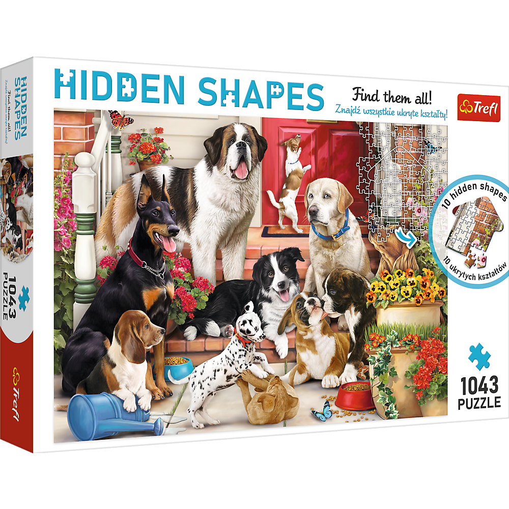 Пазли - (1043 елм.) - Приховані пазли: "Собачі ігри" Серія прихованих форм - це подвійна доза веселощів. Помістіть головоломки і відкрийте приховані форми. Весело собак має 10 унікальних форм, які видно лише після розміщення головоломки. Веселіться і знайдіть їх Весь! Після прокладки буде створено зображення з розміром 683x480 мм. Головоломки призначені для дорослих чи дітей старше 14 років.