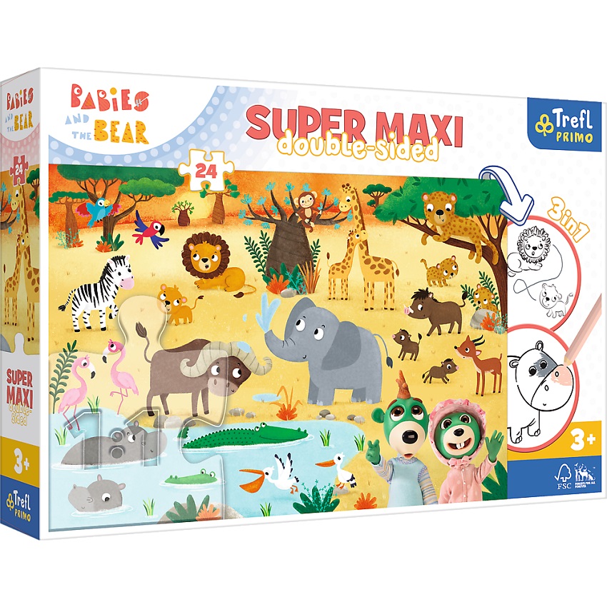 Пазли + розмальовка - (24 елм.SUPER МАХІ) - "Дітки на сафарі" Bobaski на Safari - головоломки з Prime Series - це три ігри в одному продукті! Велика подвійна головоломка для маленьких дітей віком від 3 років ідеально підходить для дітей, які за ними лежать менше елементів. Головоломки поділяються на 24 великі елементи. На звороті кожної головоломки є дві ігри - книга -розмальовки та гра з розмальовками - виклик для справжніх розумних! Головоломка Super Maxi 24 - це поєднання великої забави з радістю незалежного творіння. Є дизайни з улюбленими героями анімаційних фільмів та серіалів для дітей.