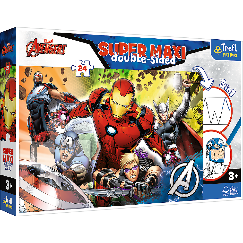 Пазли + розмальовка - (24 елм.SUPER МАХІ) - "Разом сильніші" / Марвел: Месники Сильні Месники - головоломки з серії Prime - це три ігри в одному продукті! Велика подвійна головоломка для маленьких дітей віком від 3 років - ідеально підходить для дітей, які за ними мають менше елементів. Головоломки поділяються на 24 великі елементи. На звороті кожної головоломки є дві ігри - книга -розмальовки та гра з розмальовками - виклик для справжніх розумних! Головоломка Super Maxi 24 - це поєднання великої забави з радістю незалежного творіння. Є дизайни з улюбленими героями анімаційних фільмів та серіалів для дітей.