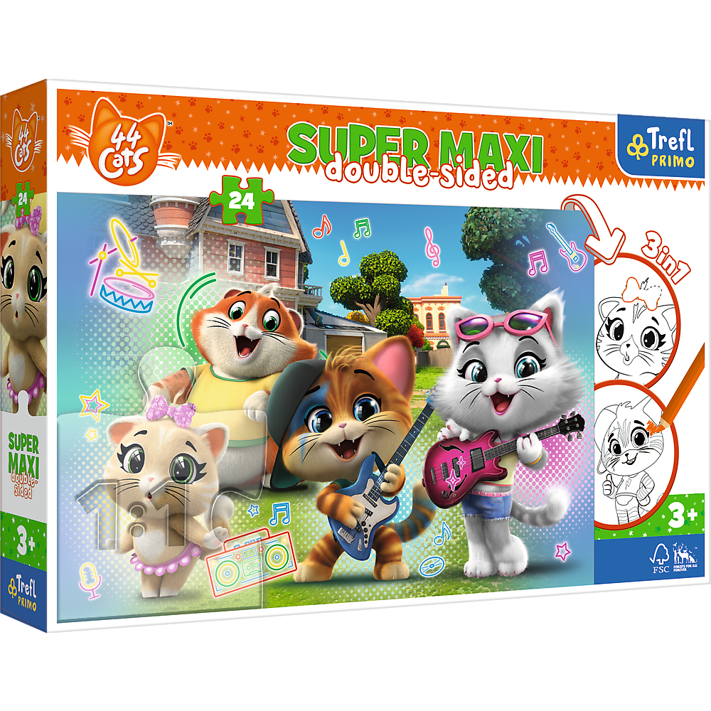 Пазли + розмальовка - (24 елм.SUPER МАХІ) - "Музичний квартет" / "44 коти" Happy cats - це три гри в одному продукті!Великий двосторонній пазл для маленьких дітей від 3 років. Пазли поділені на 24 великі частини.На зворотному боці кожного пазла є дві гри - книжка-розмальовка та гра з елементами розмальовки - виклик для справжніх героїв!Пазл Super Maxi 24 — це чудова розвага та радість створювати його самостійно. Є викрійки з улюбленими героями мультфільмів і серіалів для дітей.