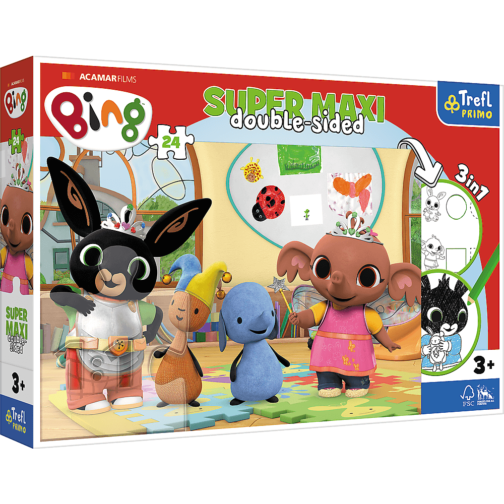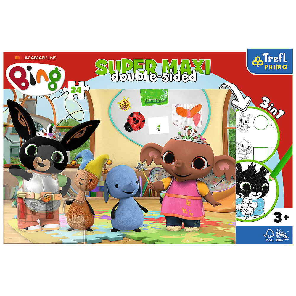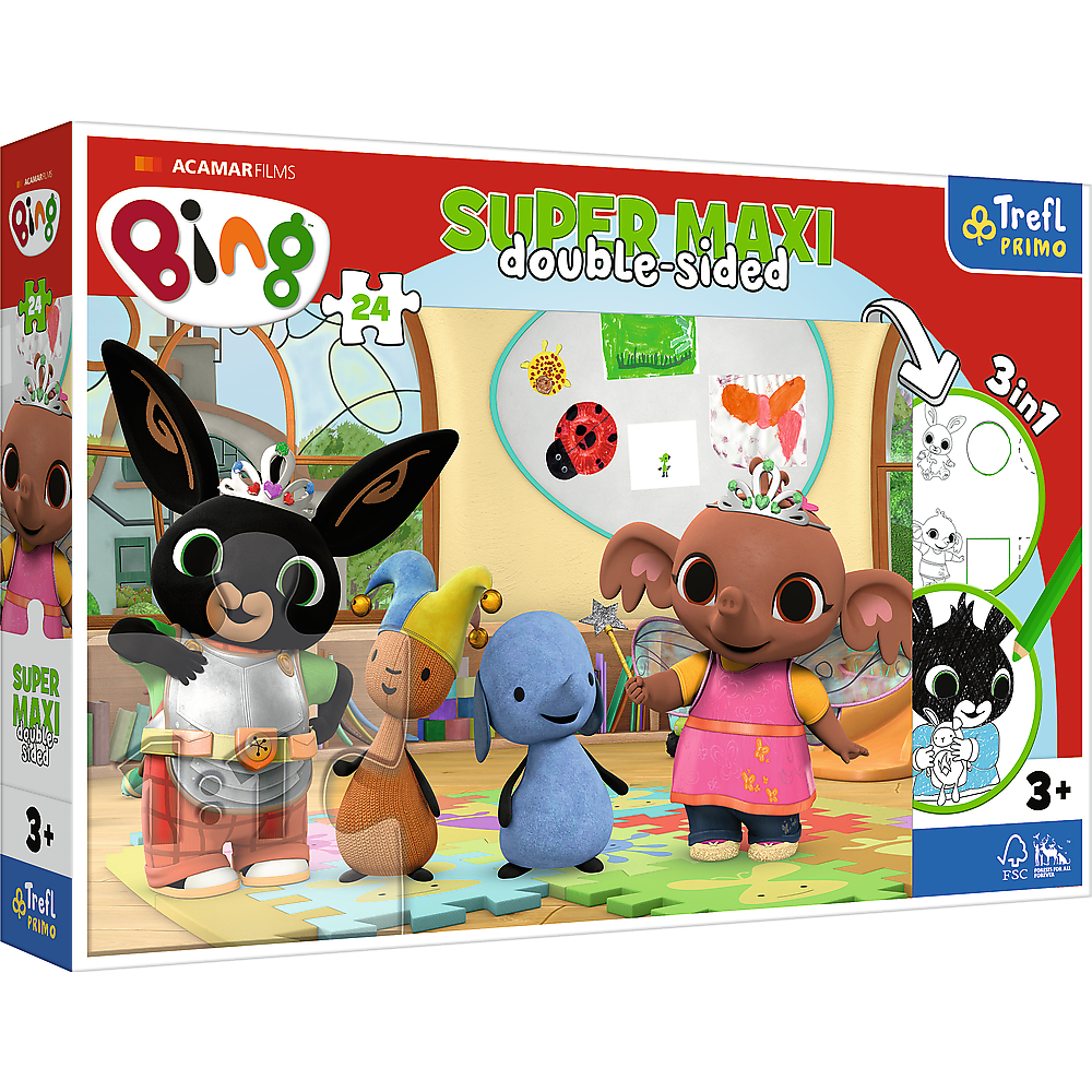 Пазли + розмальовка - (24 елм.SUPER МАХІ) - "Друзі з дитинства" Бінг з друзями - це три розваги в одному продукті!Великий двосторонній пазл для дітей від 3 років - ідеально підходить для малюків, які вміють складати менше елементів. Пазл розділений на 24 великі частини.На зворотному боці кожного пазла є дві гри - розмальовка та гра з елементами розмальовки - виклик для справжніх розумників! Пазли Super Maxi 24 - це поєднання веселощів і радості від самотворення. В наявності викрійки з улюбленими героями мультфільмів і серіалів для дітей.