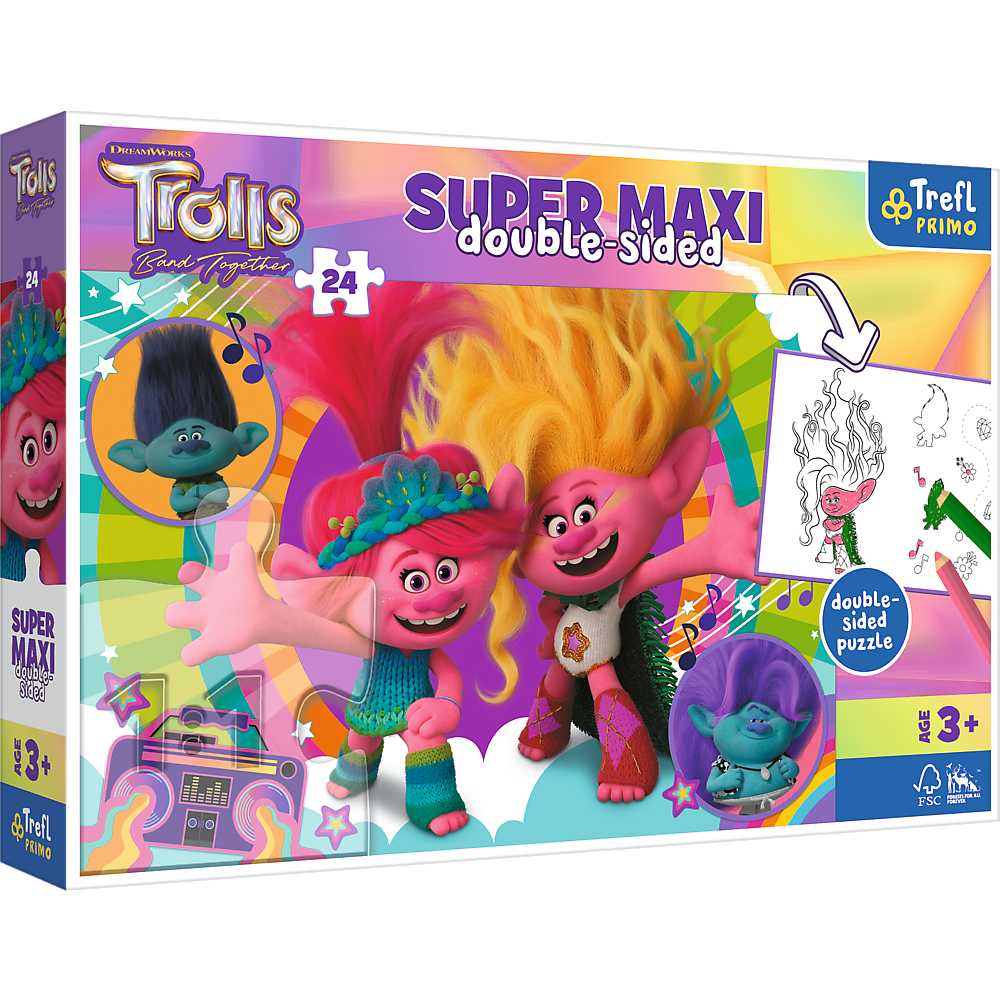 *Пазли + розмальовка - (24 елм.SUPER МАХІ) - "Музика тролів"/Trefl "Музика тролів" - це пазл , що складається з 24 дуже великих частин. Вони створені для всіх шанувальників мультфільму Тролі . Після складання пазла буде створена велика картина розміром 600x400 мм.Виріб виготовлено з високоякісних матеріалів, з використанням спеціального каландрового паперу, який відбиває світло, що полегшує його компонування. Виріб вироблено в Польщі, для виготовлення використовувалися екологічні матеріали.