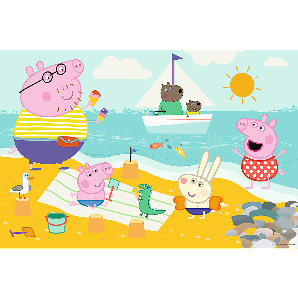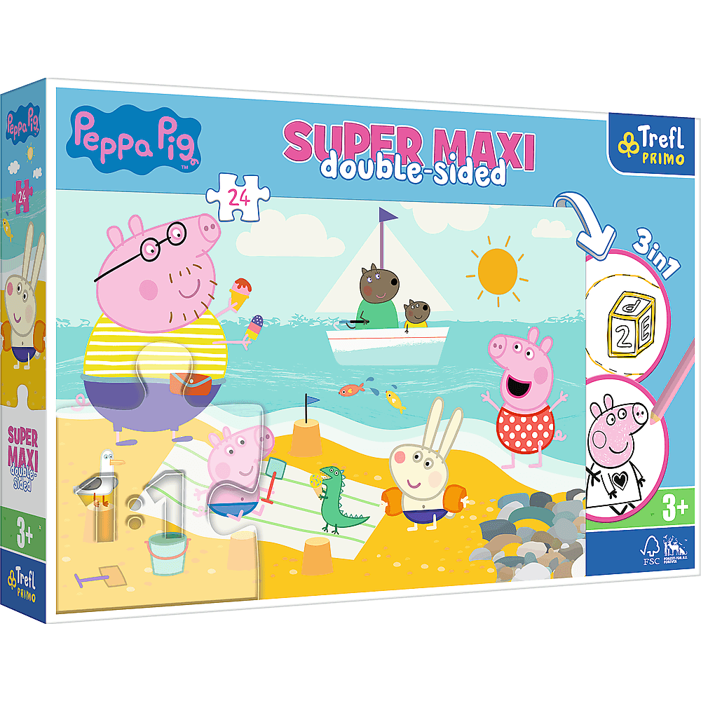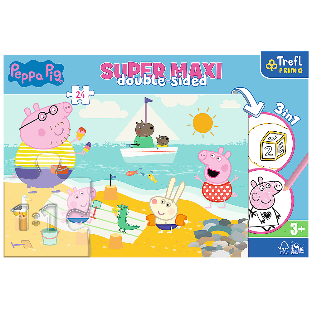 Пазли + розмальовка - (24 елм.SUPER МАХІ) - "Щастливий день" / Веселе поросятко Радісний бадьорий день - це головоломка, що складається з 24 великих елементів, створених для любителів казки Peppa Pig. На звороті головоломки є книга -розмальовки та гра з розмальовками, які диверсифікують будь -яку забаву. Поєднайте велику забаву з радістю створити себе! Після прокладки буде створено зображення з розмірами: 600x400.