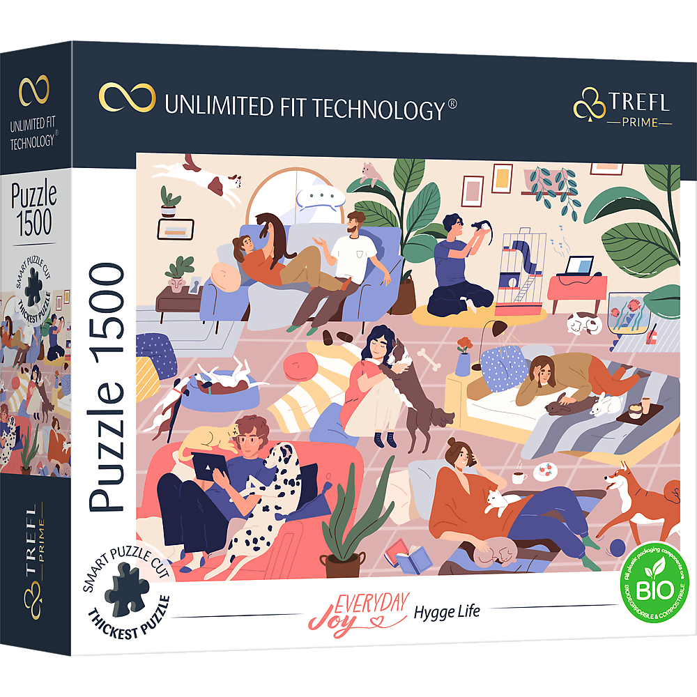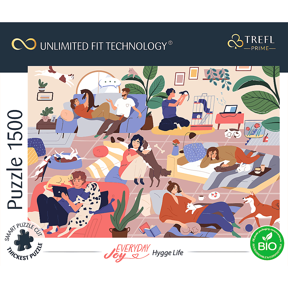 Пазли - (1500 елм.) - Безмежна колекція: "Домашні улюбленці" Пазли із серії Trefl Prime Unlimited Fit Technology, що складається з 1500 елементів, ідеально підійдуть справжнім шанувальникам головоломок! На пазлах зображені люди, які відпочивають з тваринами . Після укладання вийде малюнок розміром 850х580 мм.Пазли виготовлені з високоякісних матеріалів з використанням найщільнішого картону, унікальних форм і особливого способу вирізання. Завдяки цьому ми можемо створити індивідуальний колаж і легко переміщати пазл. Крім того, окремі елементи виготовлені з екологічних матеріалів. Розрядний пакет і наклейки виготовлені з біорозкладаної фольги. Вироби не упаковані в термоусадочну упаковку.